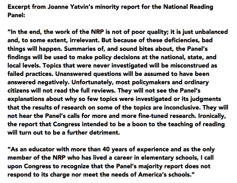 Prescient then and now, Joanne Yatvin’s minority report as part of the National Reading Panel is a must read (scroll to about page 444), and regretfully can be applied to every aspect of the enduring accountability-based education reform movement; see this excerpt: