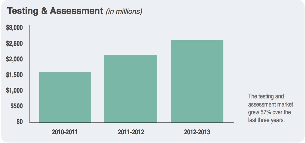 A Software & Information Industry Association report reveals, “testing and assessment products–which include software, digital content and related digital services–now make up the largest single category of educational technology sales,” increasing by 57% since 2012-2013: