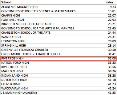 Children in this housing development will attend, eventually, Riverside High, which is ranked 13th lowest of 237 SC high schools in the 2014 Poverty Index, has Excellent/Excellent ratings on the 2014 SC report card, and tests only 51/341 students on subsidized meals and 25/341 with limited English proficiency: