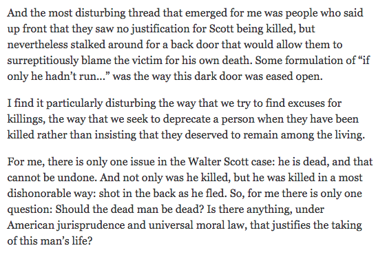 That Scott’s killing is documented by a video that also exposes the officer’s horrifying dishonesty, one would expect the equivocations to be nearly silent; however, the subtle racism following Scott’s shooting is the “rogue cop” argument, the concession that all professions have some “bad apples” (that phrasing particularly tone deaf and offensive since a 50-year-old, unarmed man was shot 8 times in the back and killed by an officer sworn to protect and serve). Or as Leonard Pitts Jr. confronts, discounting each shooting as an “isolated incident.”