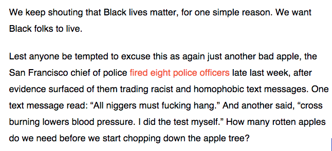 The “one bad apple” denial keeps the gaze superficial, in order to deny systemic racism, and fails to witness when even black police officers are agents of a racist system (in ways replicated all throughout history and society when individuals from an oppressed group are themselves drawn into the bigotry codified by policy, law, or tradition).