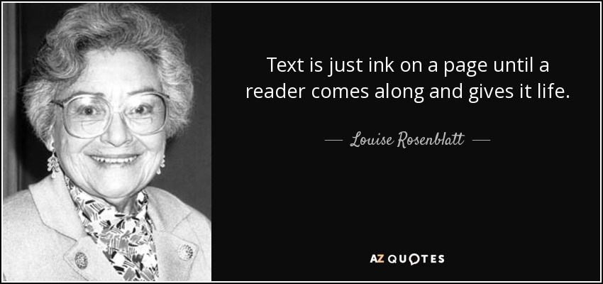 A former graduate student of mine and current doctoral student has been discussing by email with me Rejan’s piece as she investigates Rosenblatt. She has confessed, in fact, that she knows little about literary theory because that topic wasn’t covered well in her undergraduate English courses, leaving her with a “superficial” understanding—all of which reinforces Rejan’s central concerns.