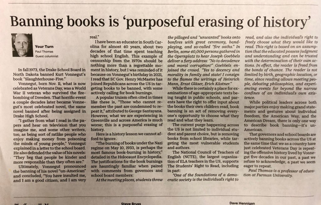 I have been an educator in South Carolina for almost 40 years, about two decades of that time spent teaching high school English. This example of censorship from the 1970s should be nothing more than a regrettable moment in history, but I was reminded of it because on Vonnegut’s birthday in 2021 I read that SC Governor Henry McMaster has joined Republicans across the U.S. who are not only banning books, but actively calling for book burnings.