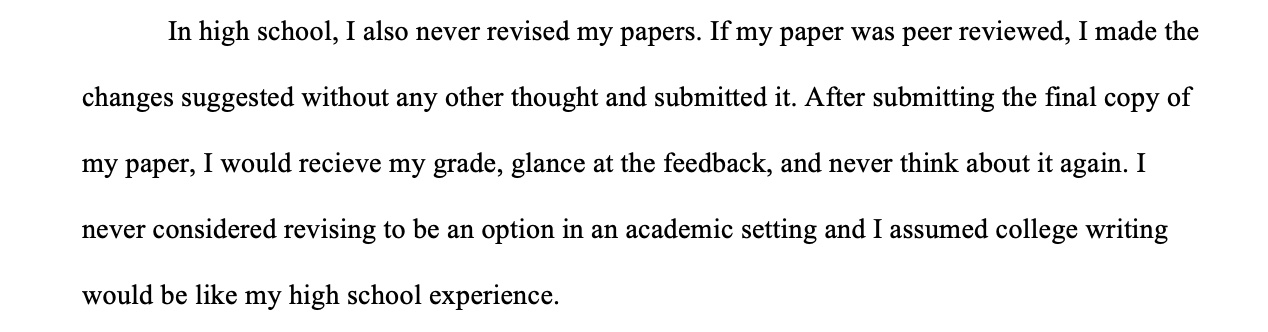 While teaching my FYW students, I am preparing them for the demands of disciplinary writing and ultimately for writing as scholars in potentially any field once they declare a major; I also anticipate that several of my undergraduates will move to graduate degrees, where scholarly writing includes even greater demands.