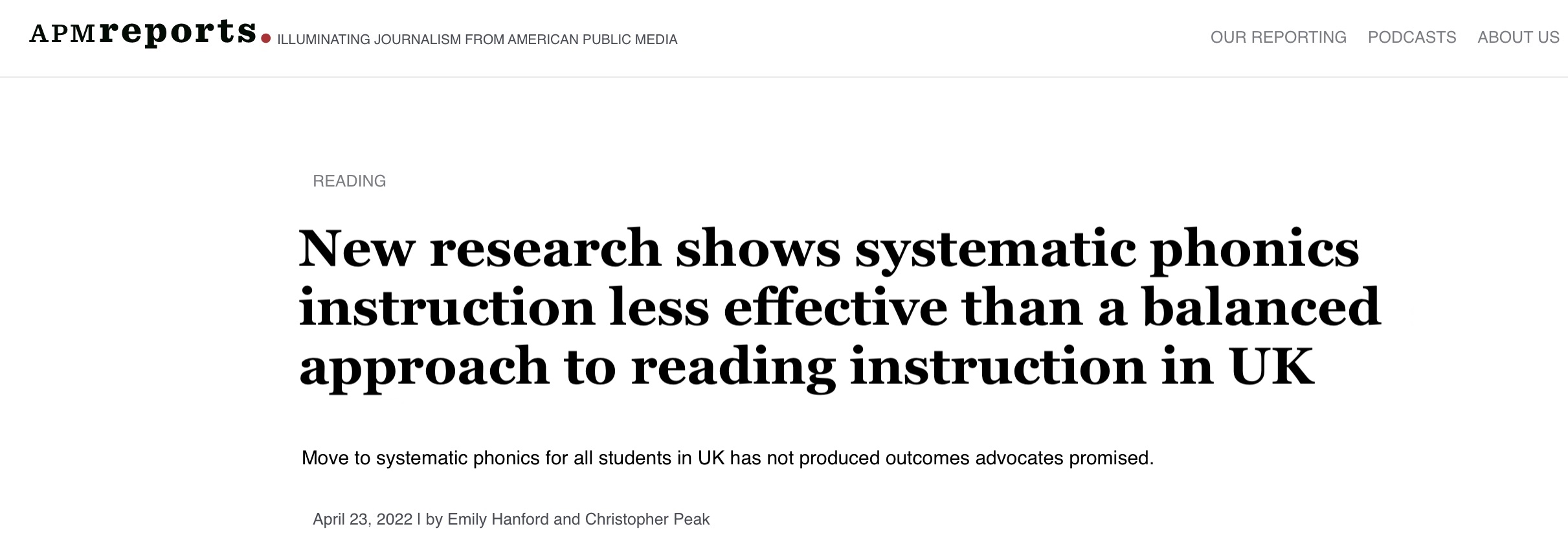 When people complain about bias, one aspect of bias often ignored is that all media determine what to cover and what not to cover (Hanford covers anything that seems to further the “science of reading” propaganda, and ignores anything that challenges it). In the case above, the research on reading recovery is easy to twist into the “science of reading” agenda, but the research from the UK is a whole different matter.