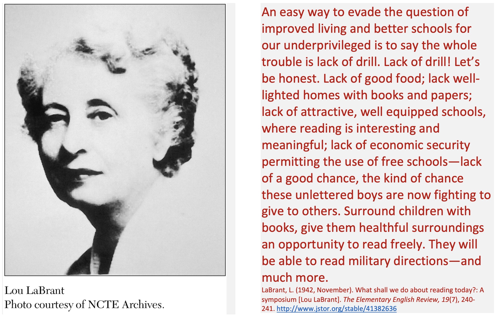 LaBrant, L. (1942, November). What shall we do about reading today?: A symposium [Lou LaBrant]. The Elementary English Review, 19(7), 240-241. http://www.jstor.org/stable/41382636