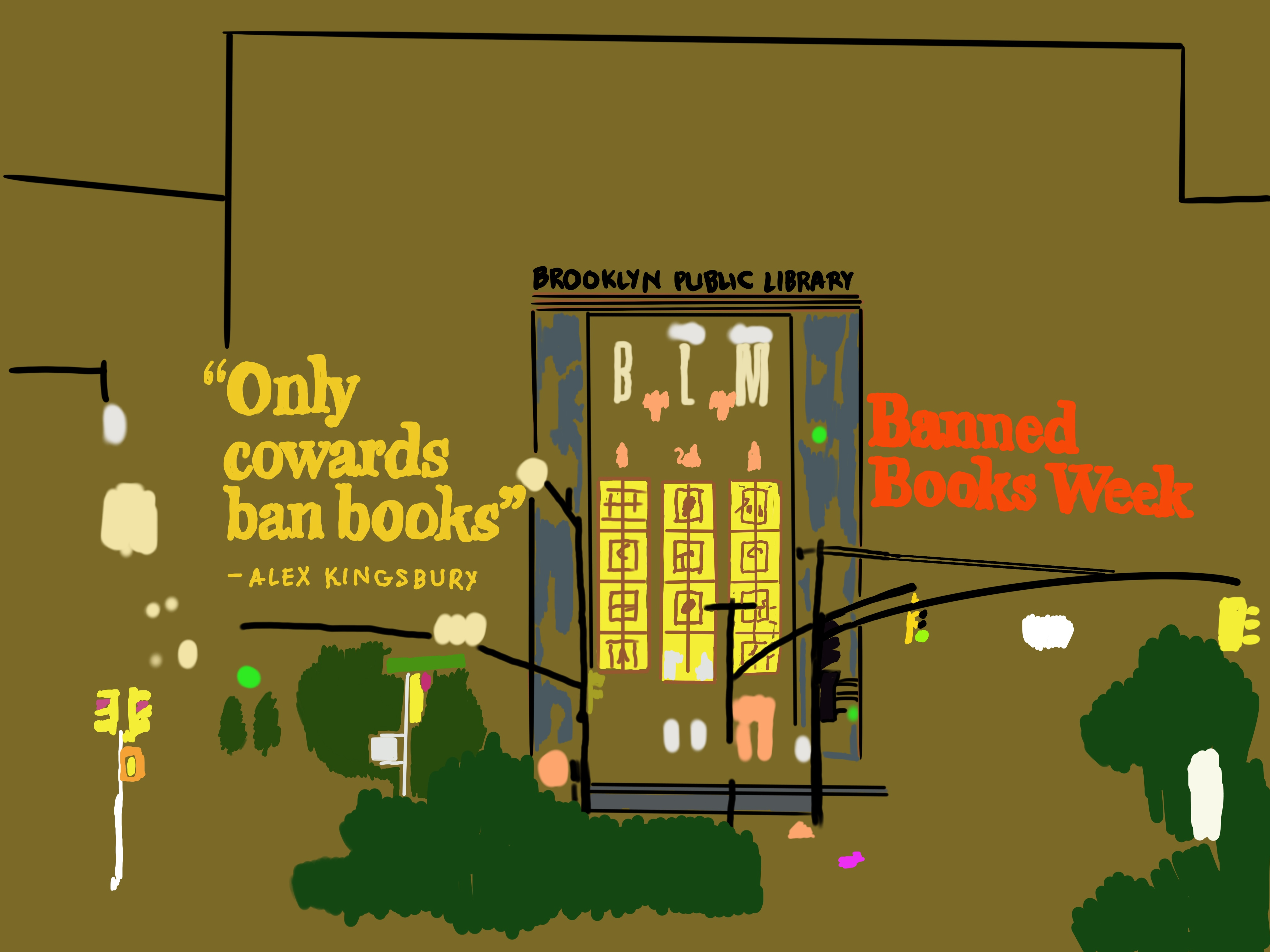 First, I based “Only Cowards Ban Books” on a photograph I took at the Brooklyn Public Library. Part of my purpose here was to play with colors and since this addresses censorship, I have a great deal of space where parts of the original photograph are missing.