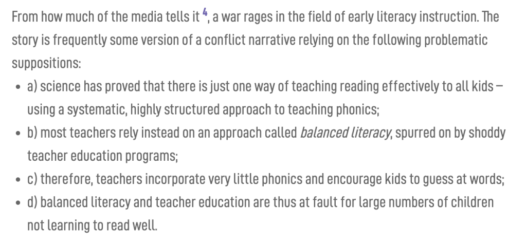 Next, the SOR story claims teachers are not well prepared to teach reading and teacher educators either fail to teach evidence-based methods or willfully ignore the science.