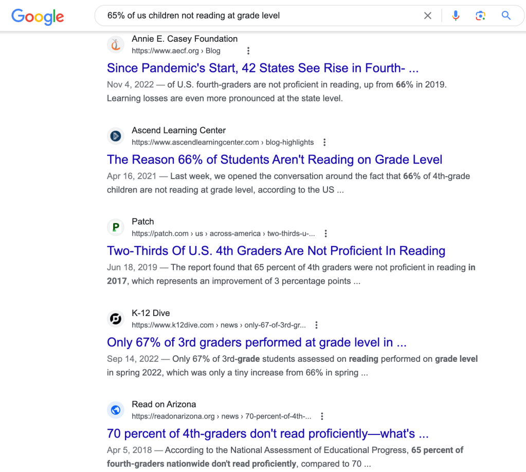 That 2/3 of US children are below grade level reading is a staggering and damning statistic, nearly hard to believe until you do a little simple Googling: