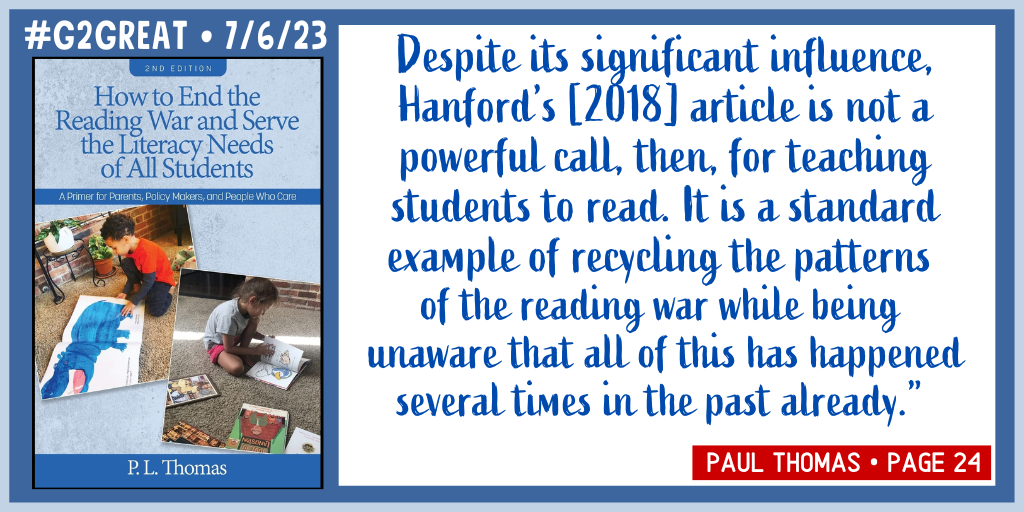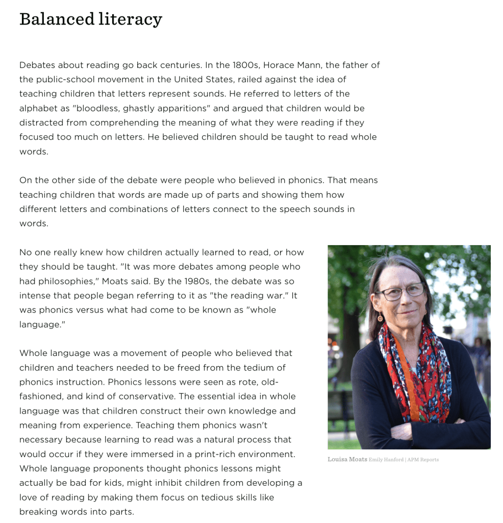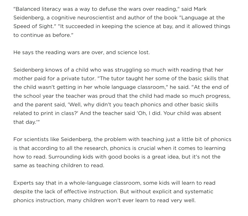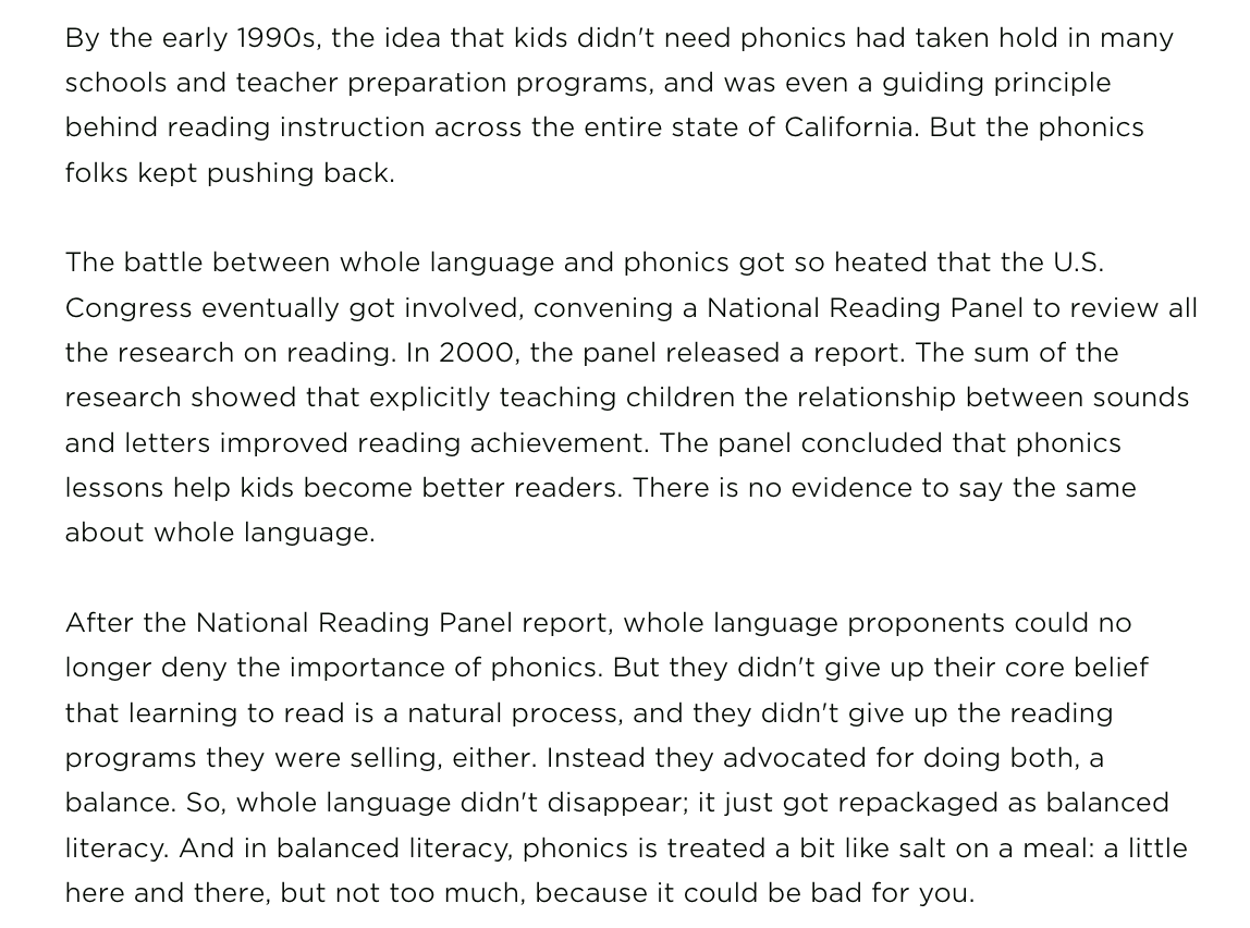 The “science of reading” movement is mostly journalism, anecdotes, and politics. Note that the movement has its roots in Emily Hanford’s Hard Words, which established misinformation and misunderstanding NAEP, whole language, and balanced literacy.