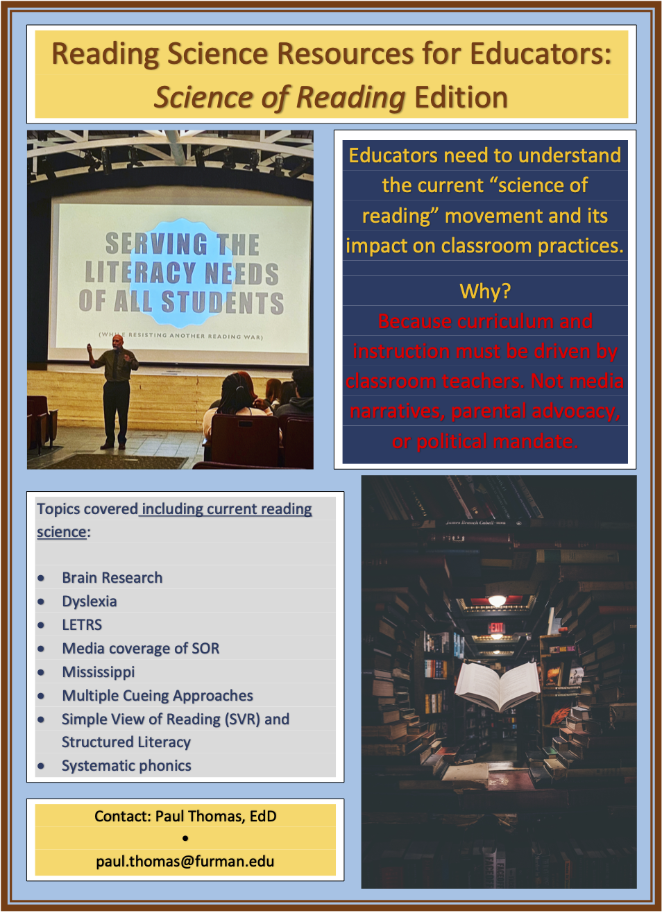 The “science of reading” (SOR) movement has shifted from media stories to state legislation and instructional policy. This workshop invites teachers to critically examine media claims about reading, teachers of reading, and teacher educators against the full body of reading science. The topics will include history of reading crises, the simple view of reading, NAEP, the Mississippi “miracle,” balanced literacy and reading programs, dyslexia, three cueing, brain science, and an overview of reading science.