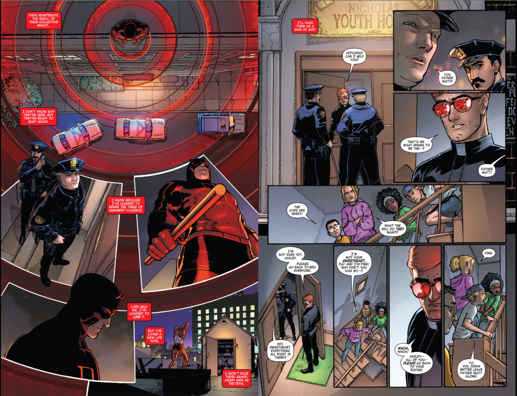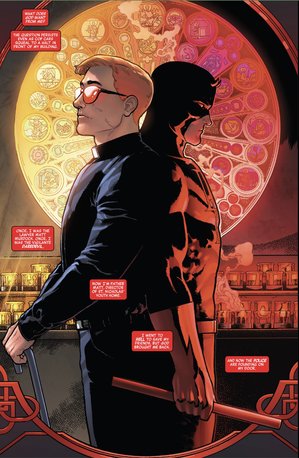 The current reboot (v8) of Daredevil with a new creative team—Saladin Ahmed and Aaron Kuder—includes a soft shift back to Daredevil as a street-level superhero with a clever twist, “Recently, Matt somehow returned to life—born again as a Catholic priest”: