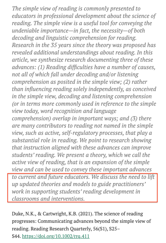 Let’s do a thought experiment for a moment: Which do you think the general public and political leaders are more familiar with (or familiar with at all), Emily Hanford’s Sold a Story or Nell Duke’s (with colleagues) work on the active view of reading?