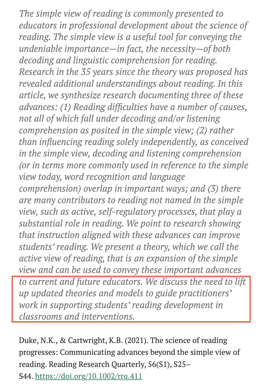 Let’s do a thought experiment for a moment: Which do you think the general public and political leaders are more familiar with (or familiar with at all), Emily Hanford’s Sold a Story or Nell Duke’s (with colleagues) work on the active view of reading?