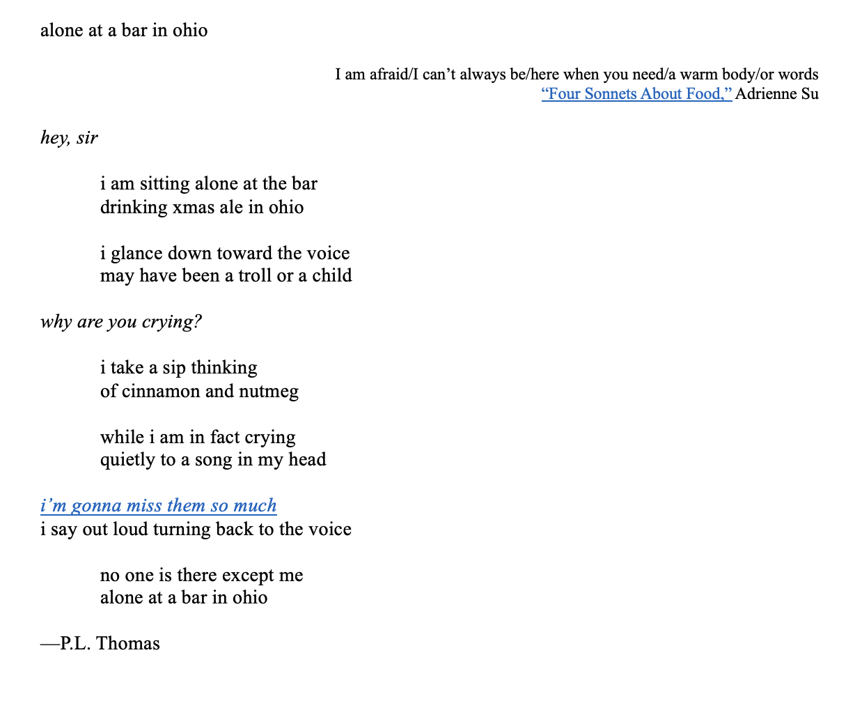 [Due to formatting challenges with WordPress, see this poem as a PDF. Note that the lyric in the hyperlinked line is from The National’s “Santa Clara” and the opening quote is from “Four Sonnets About Food” by Adrienne Su.]