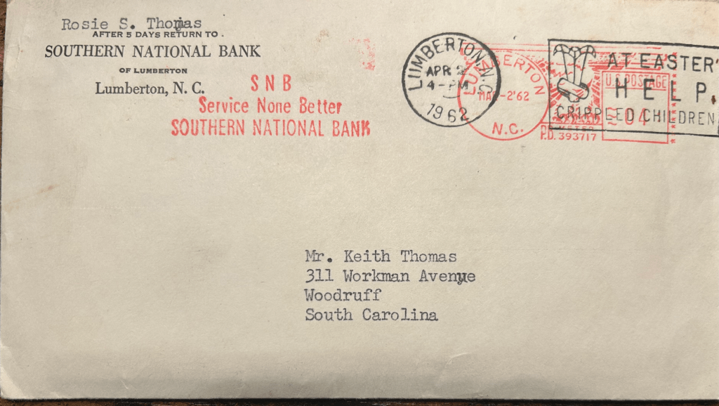 I also found a stack of letters my mother wrote from Lumberton, NC just after I turned one year old. My mother, you see, had left my father and moved back in with her parents (who moved constantly, mostly around NC but in SC also).