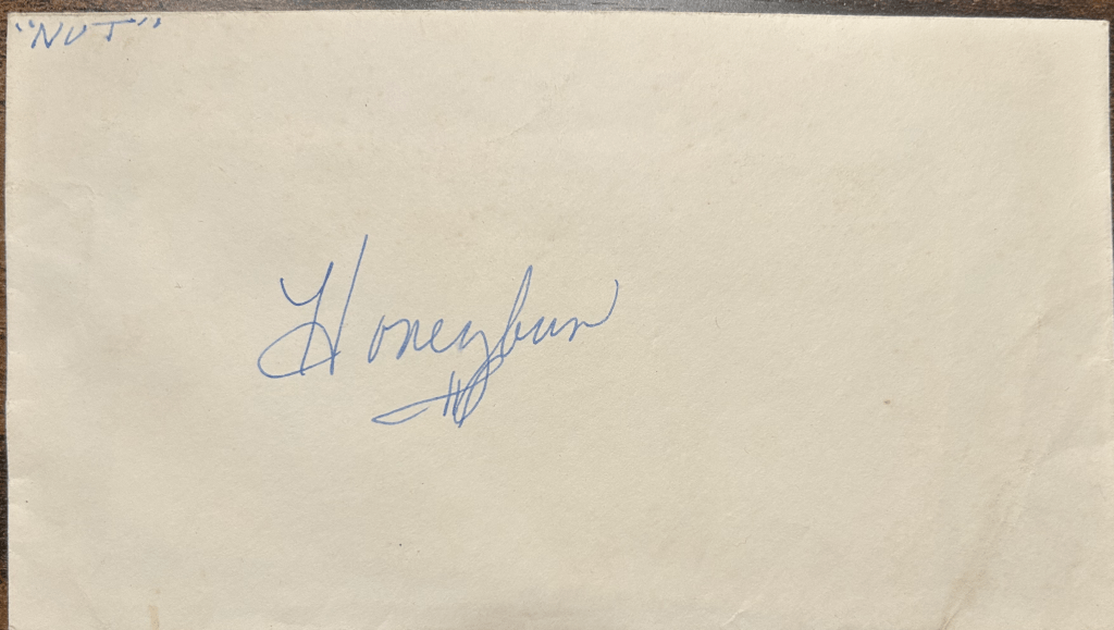 This led to their coded dialogue. Dad was “Honeybun” and Mom was “Nut,” the only two words on the envelope of one letter.