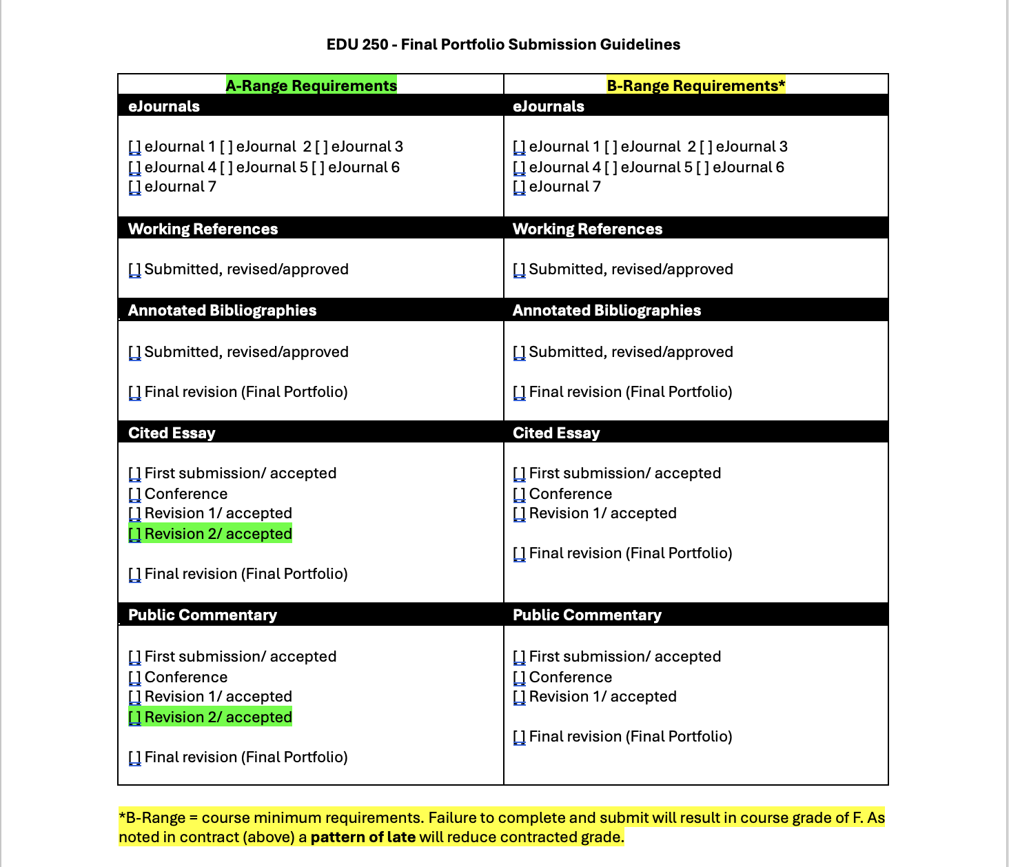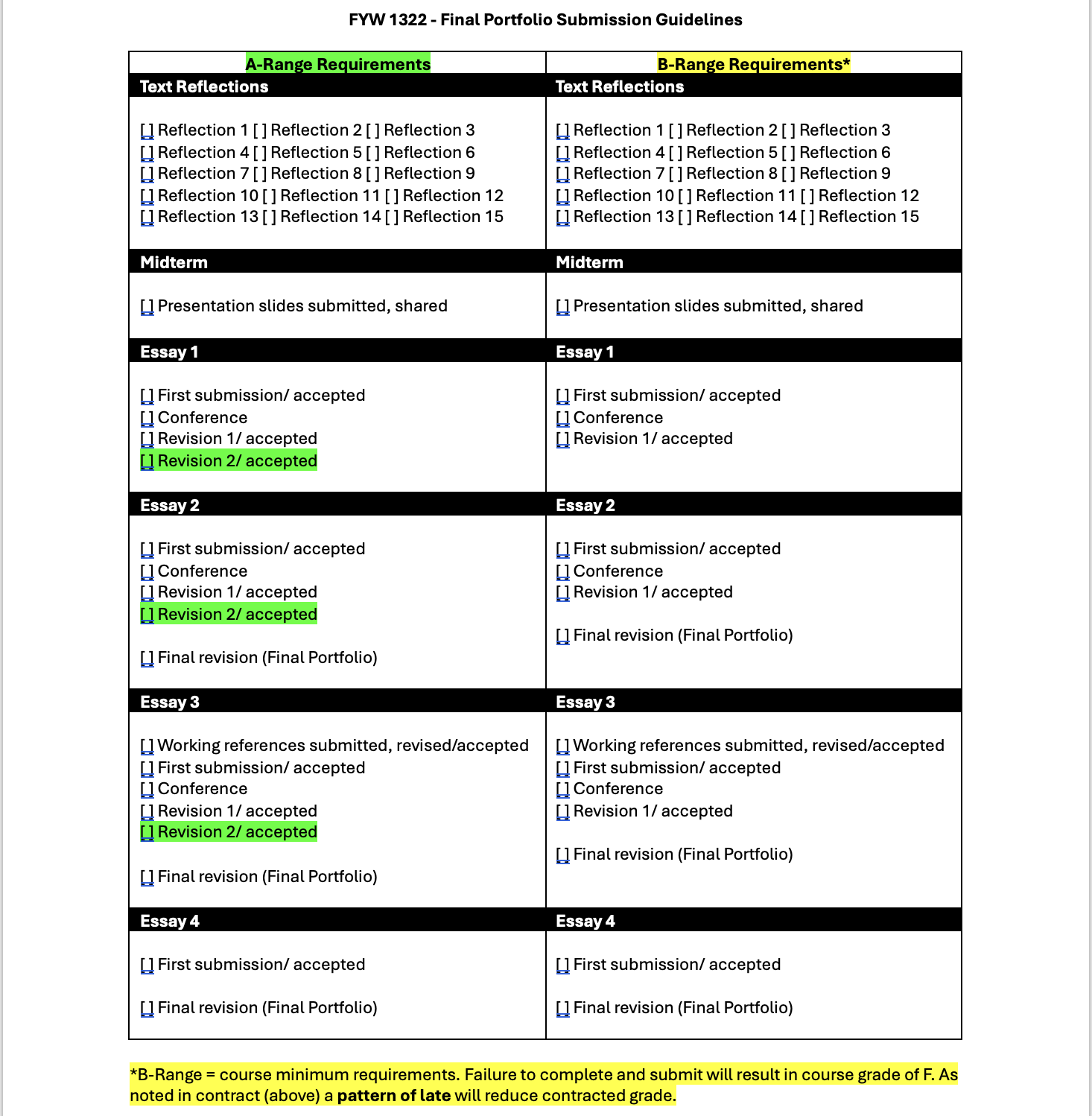 The first iteration of the course grade contract, then, focused on requiring students to submit, conference, and revise essays; I structured A and B course grades around minimum standards for the B-range (submit an acceptable essay, conference after receiving my feedback, and submit one acceptable revision that addresses the feedback) and additional revisions after more feedback for the A-range.