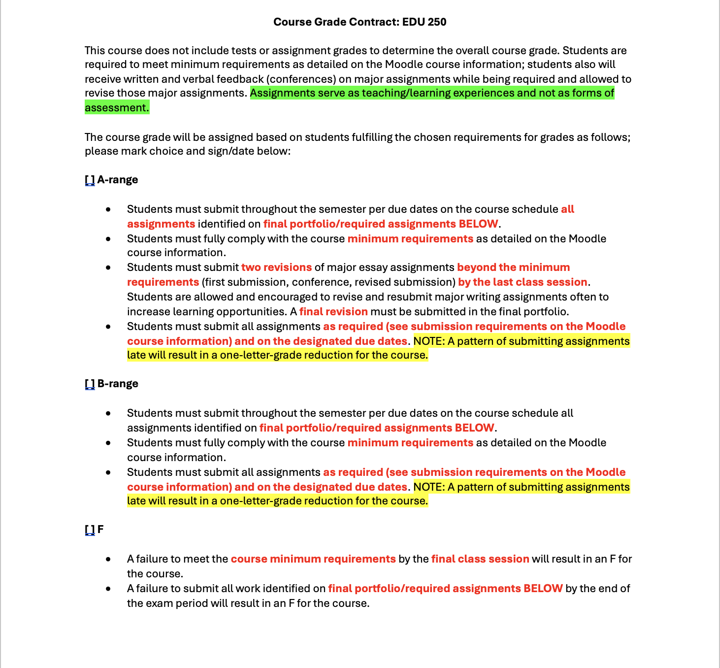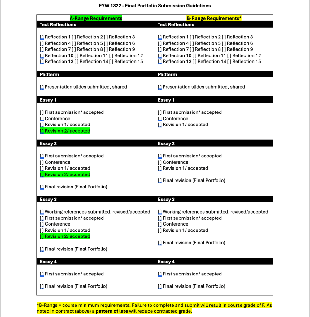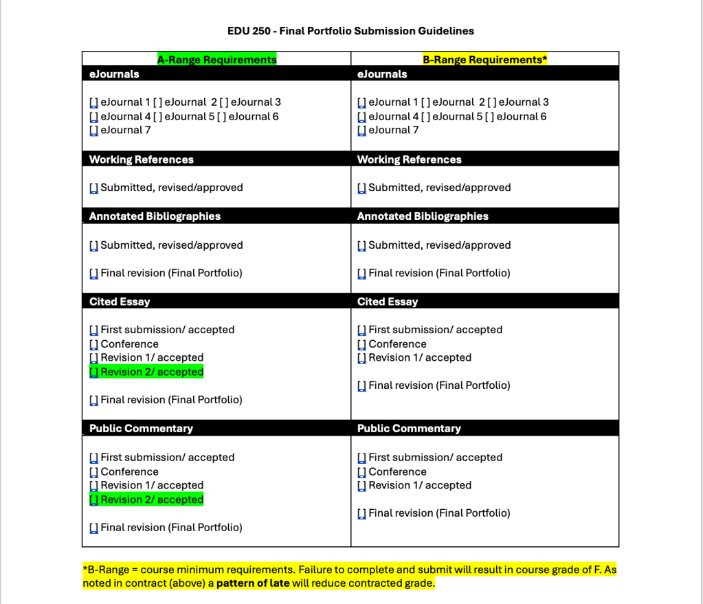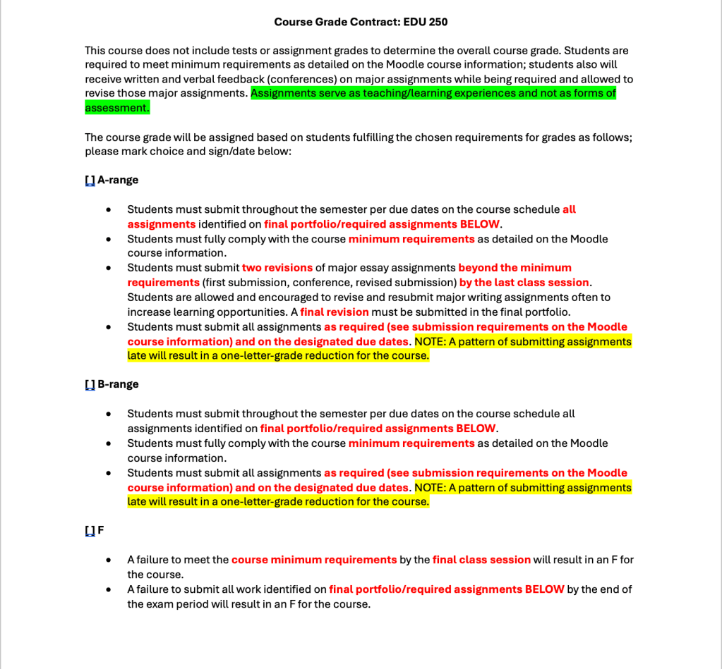 Here, then I want to share the new versions of those contracts to be implemented in spring. I have more explicitly included language about the purpose of the contract and added the final portfolio expectations in a format that also is more explicit about assignment expectations as well as fulfilling the contracted grade.