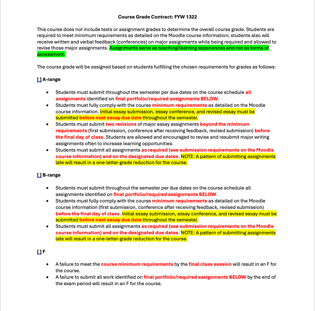 A few semesters ago, as part of that journey, I returned to the course grade contract, something I had tried in some fashion during my high school teaching years.