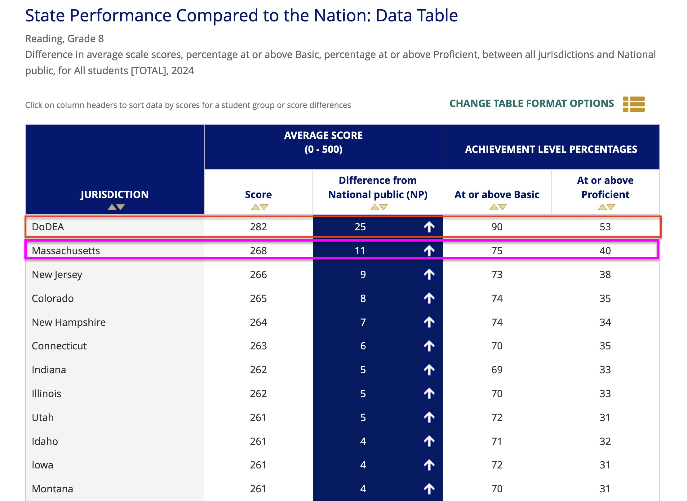 Other than top-scoring DoDEA schools, MA sits atop reading scores in the US in both grades 4 and 8: