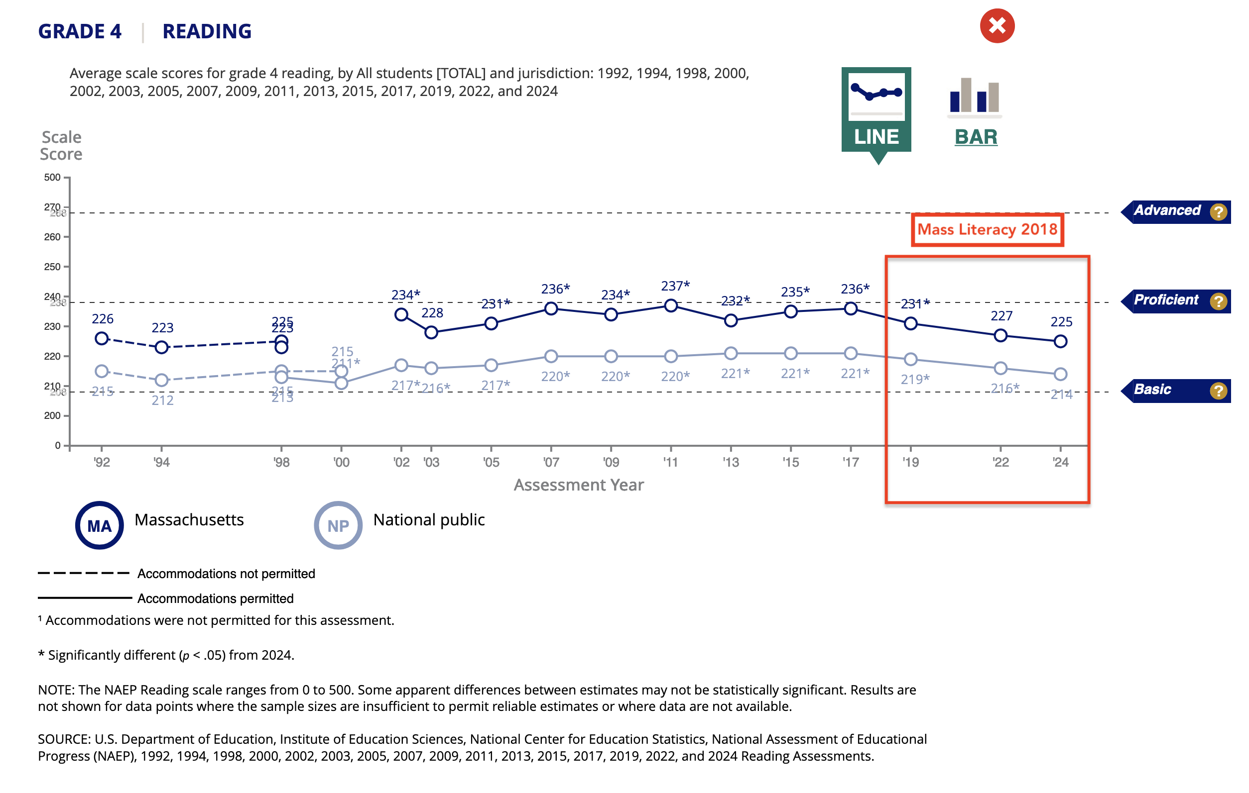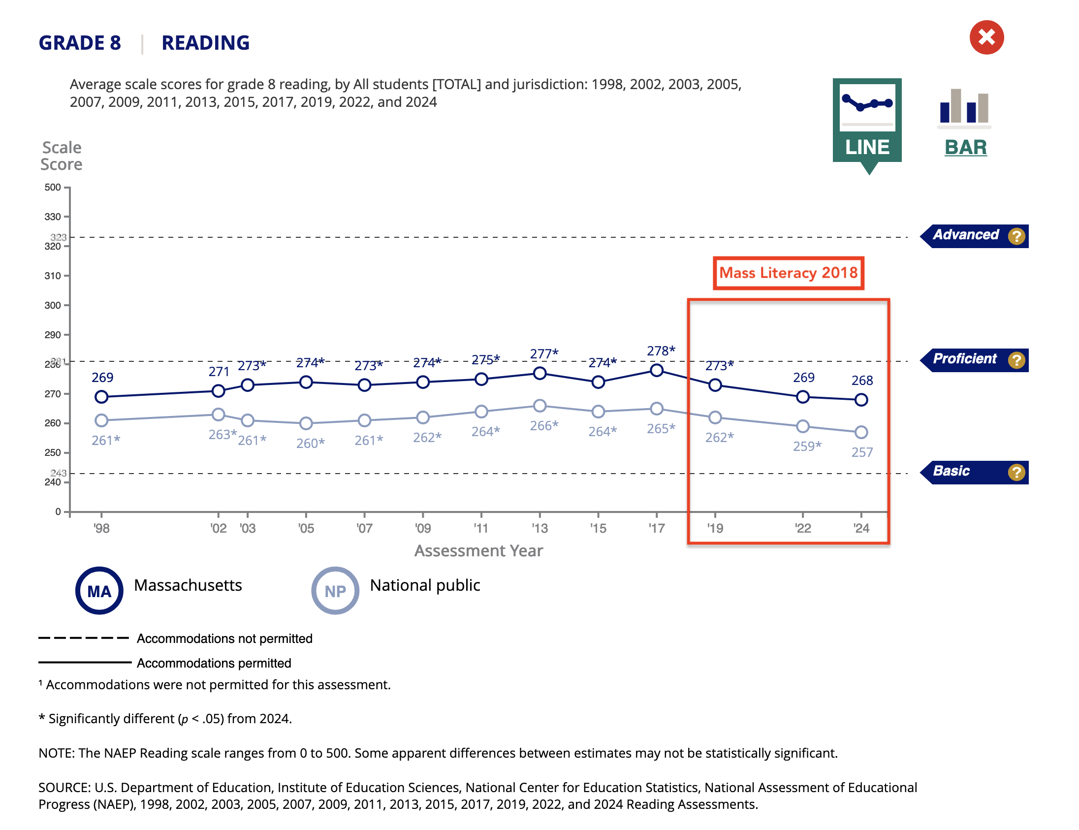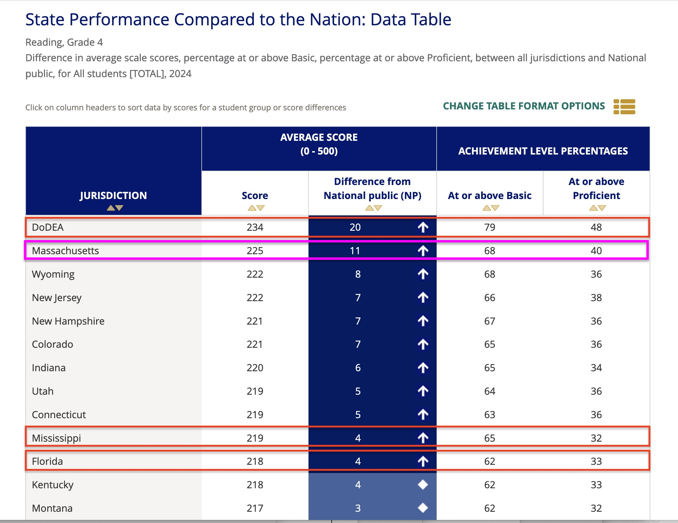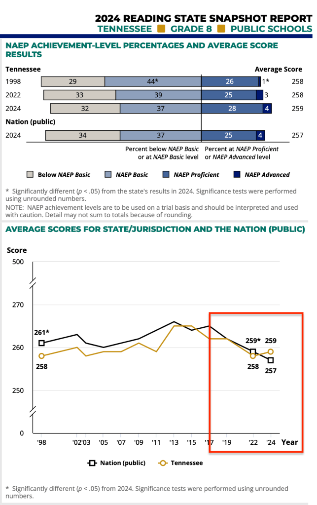 While a top-scoring state like MA is shouting “crisis” primarily based on a sort of national psychosis about the “science of reading,” TN is trying to have it both ways with a reading crisis and a celebration of 2024 NAEP scores.