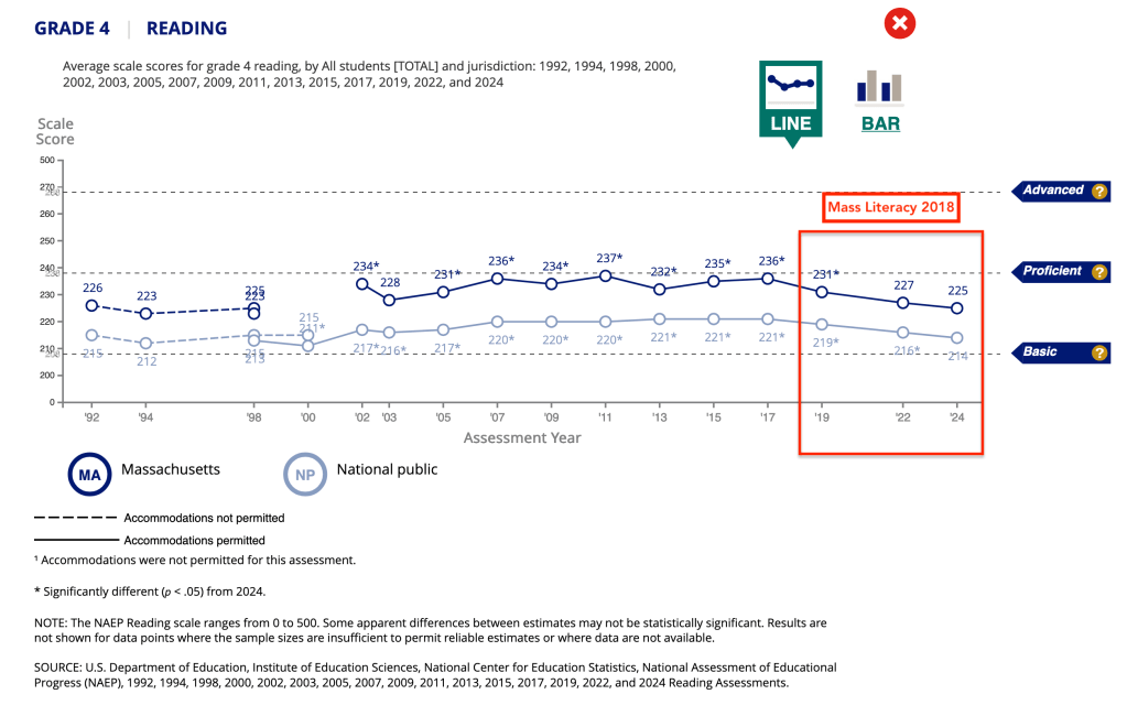 To be fair, MA is similar to most of the US where standardized tests scores have dropped post-Covid and those drops have coincided with MS’s Mass Literacy initiative from 2018: