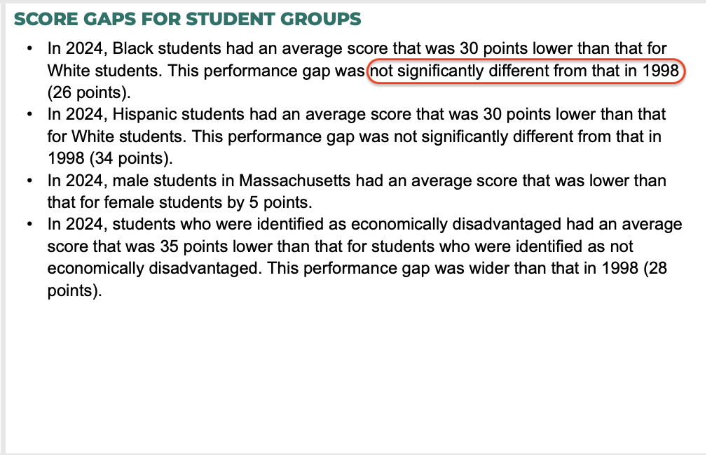 Note that MA also has something in common with almost all states regardless of whether states have high or low NAEP results. Achievement gaps by race and socioeconomic status have remained fixed for almost three decades: