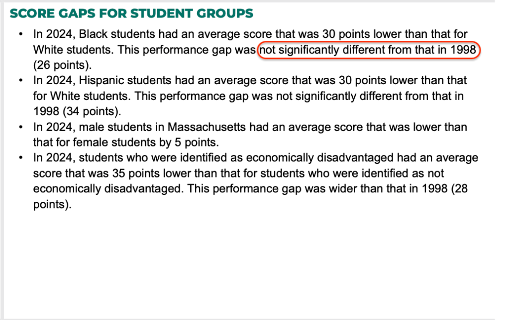 Important again is that like MA and most states, TN scores for racial and socio-economic gaps remain fixed: “This performance gap was not significantly different from that in 1998.”