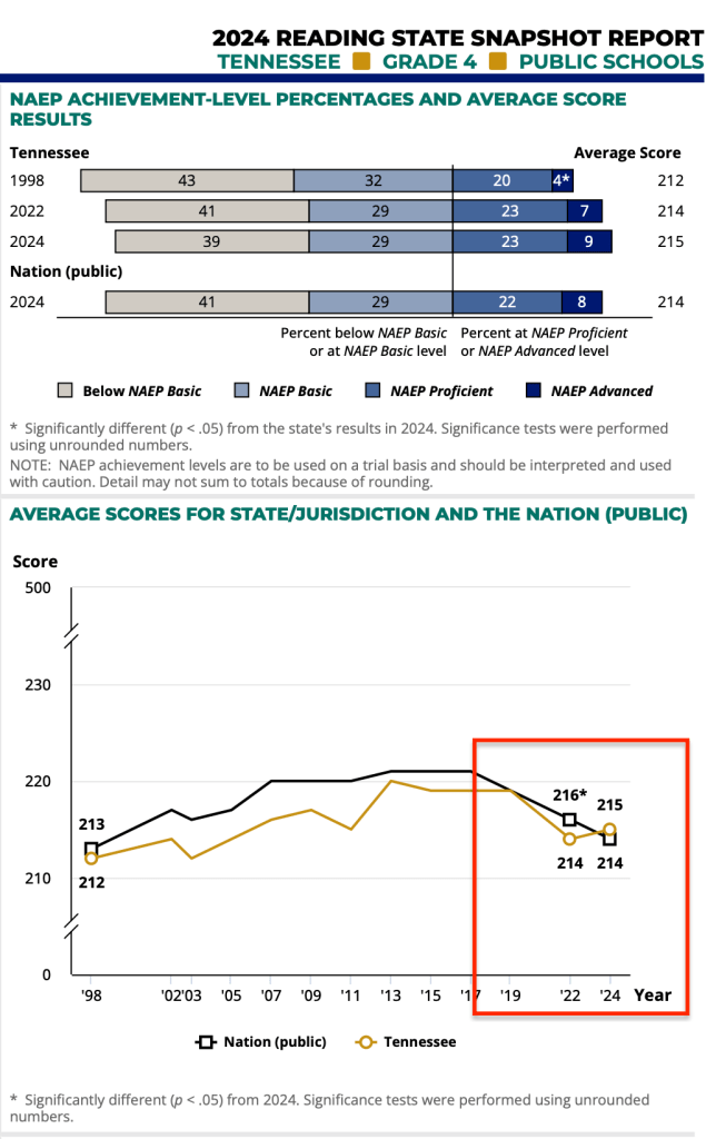 An October 2023 report from the TN Department of Education, “Tennessee’s Commitment to Early Literacy,” forefronts the “Literacy Crisis in Tennessee” based on (you guessed it) historically poor rankings in NAEP reading scores.