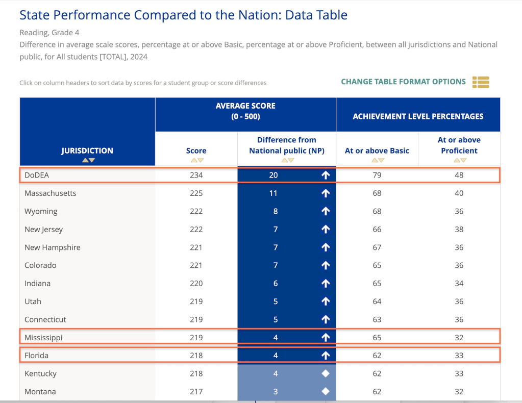Florida and Mississippi have long been applauded for aggressive education and reading reform, and in 2024, their grade 4 reading scores remained in the top 25% of states, seemingly defying the odds. But Florida and Mississippi scored again well below top-scoring DoDEA schools.