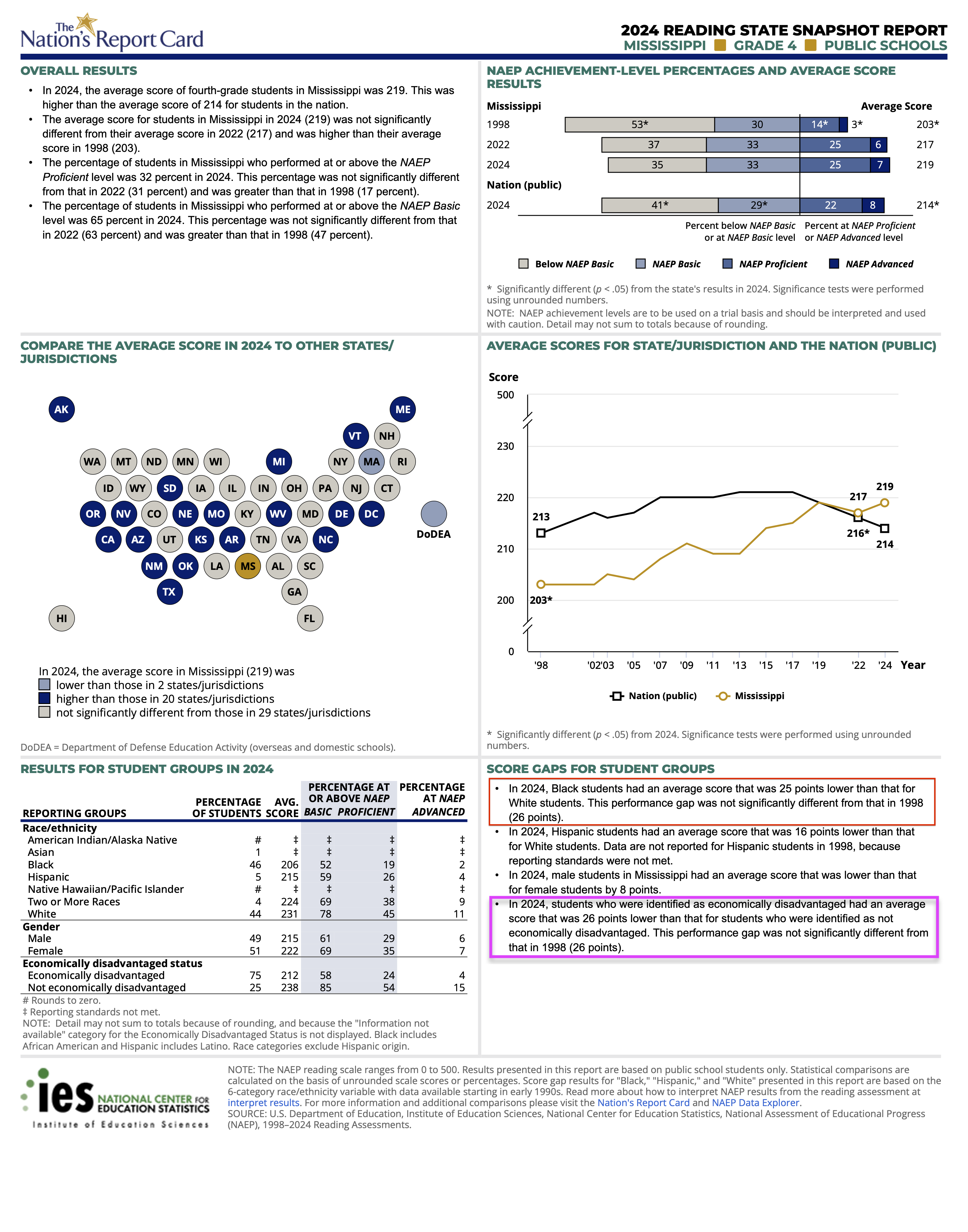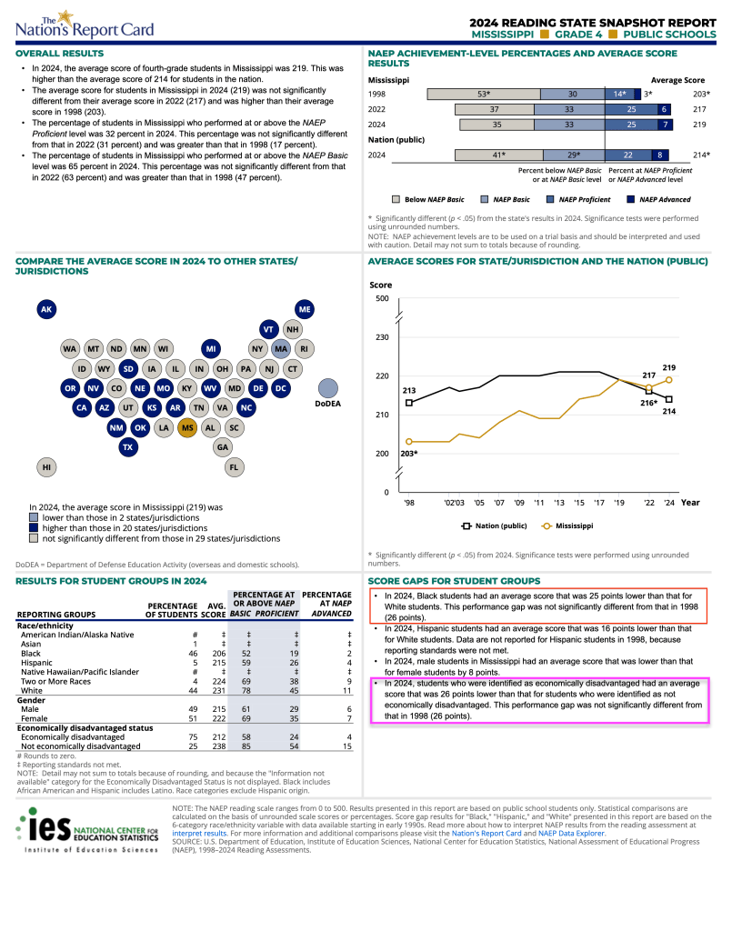 That’s right, MS has the same racial and socio-economic achievement gaps since 1998, discrediting anything like a “miracle.”
