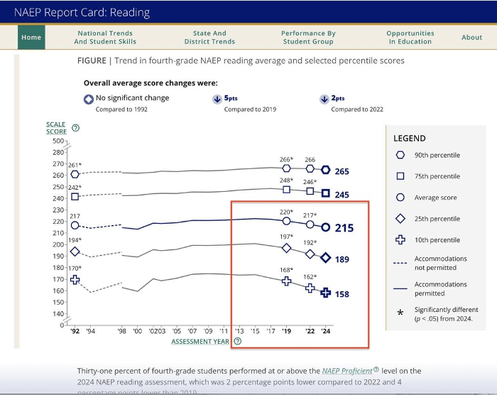 National Assessment of Educational Progress (NAEP) is the national program mandated with tracking student achievement. The 2024 results reveal that reading scores have hit their lowest point in 32 years. This decline is notable because in recent years many states have passed aggressive reading legislation, often labeled as the “science of reading” (SOR).