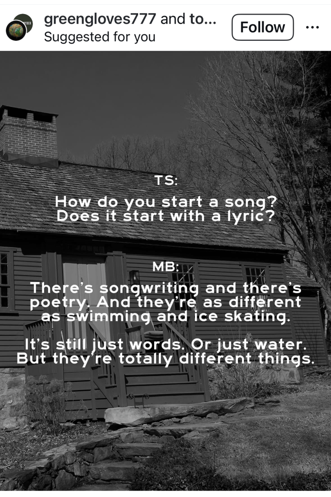 I do think songwriting is a very specific kind of thing…. It’s not—there’s poetry and there’s songwriting…. And I think they’re as different as like swimming and ice skating…. It’s like it’s still just words or just water but they’re totally different things.