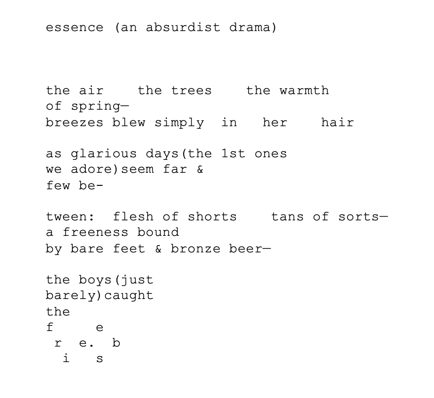 I am sitting in my dorm room of a local junior college looking out the window from the third floor of an ornate but old rock building. On that day, I wrote my first real poem, inspired by e.e. cummings’s “[In just-]” that I had recently read in my speech course with Steve Brannon.