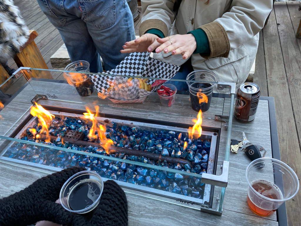 We sat outside on the deck by the river, freezing and huddled near the fire pit with the locally famous mountain and US flag just above us.