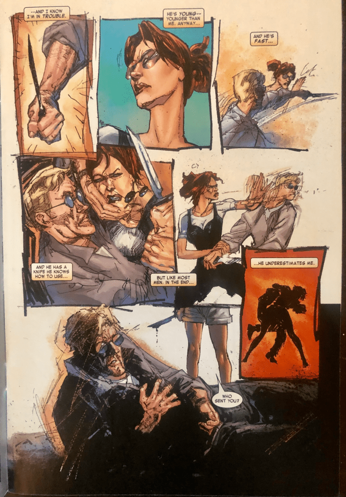 In my book-length analysis of Marvel’s Black Widow in print comic books across seven decades, one of the key themes of Natasha Romanov’s characterization is directly stated by Nat in issue 1 of volume 3, by the creative team of Richard K. Morgan and Bill Sienkiewicz: “He’s young—younger than me, anyway. And he’s fast. And he has a knife he knows how to use. But like most men in the end, he underestimates me.”