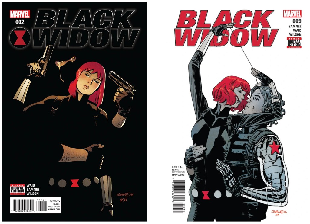 Covers for issue 002 and 009 feature Black Widow embraced. Pencil by Chris Samnee and ink by Matthew Wilson.