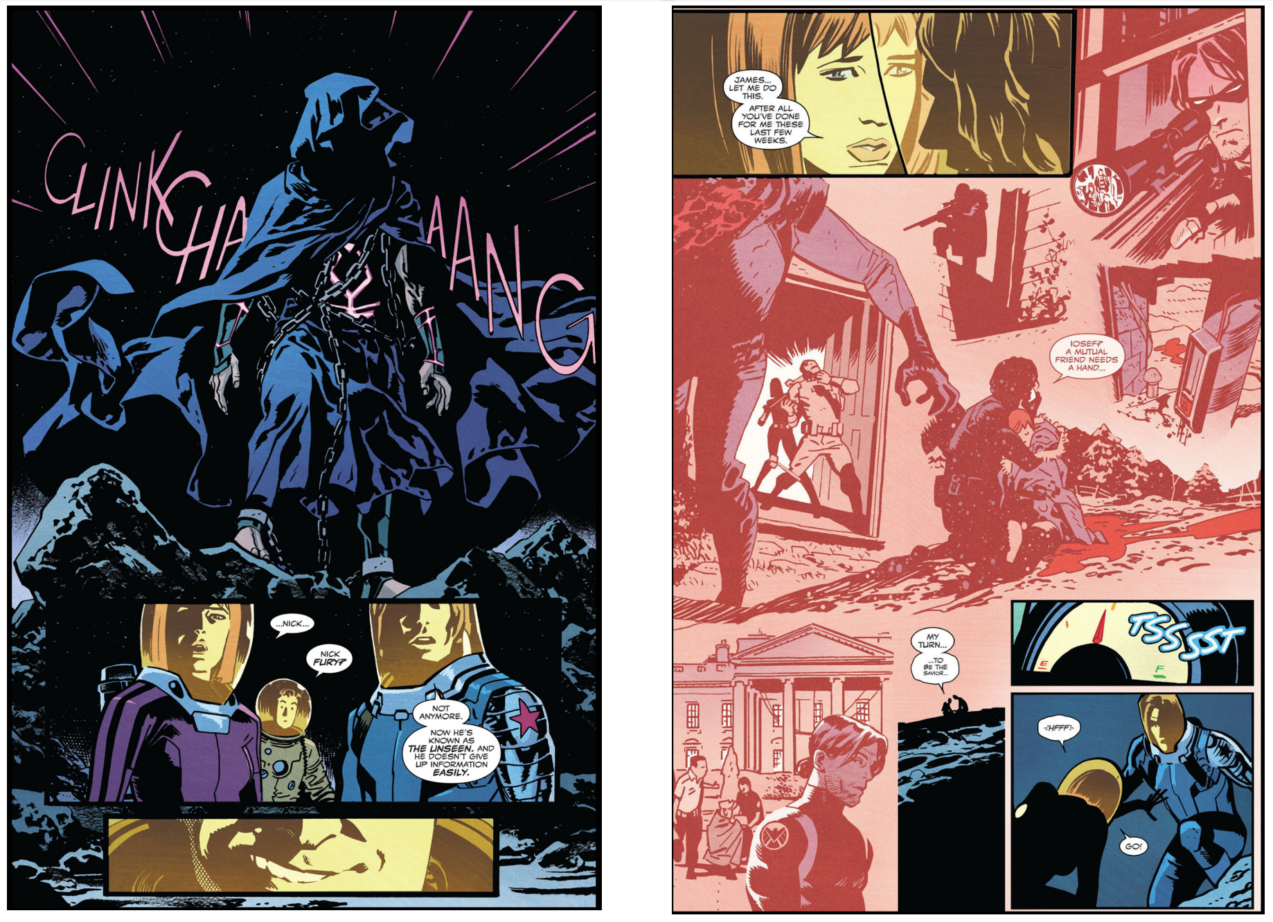 The killing of Iosef in issue 009 adds to Natasha’s fear of death in the wake of anyone knowing her, and sets up her confrontation with Recluse, who has captured Bucky Barnes. Natsha chastises Barnes for wanting to protect her, but Barnes has another mission, bringing Black Widow to Nick Fury, now The Unseen.