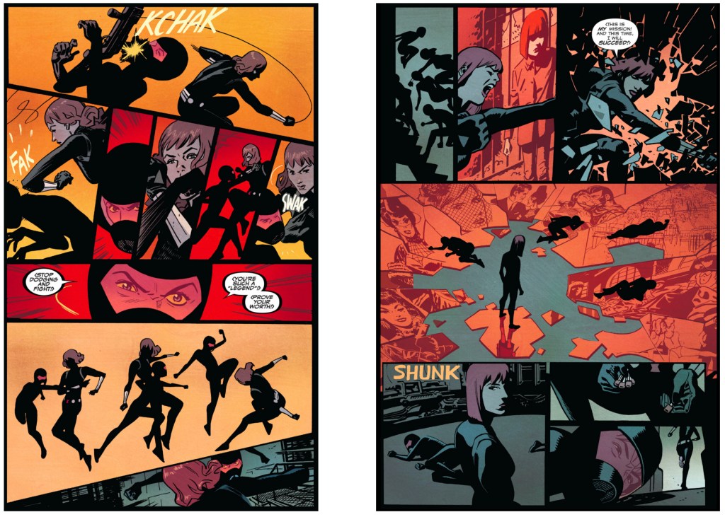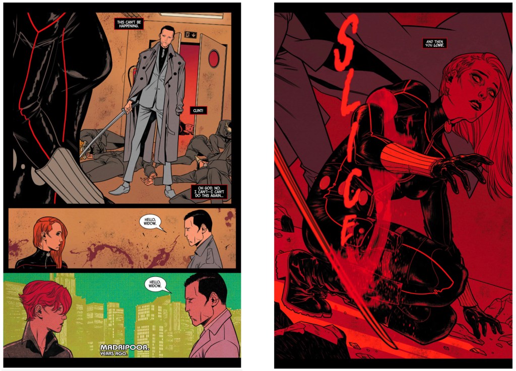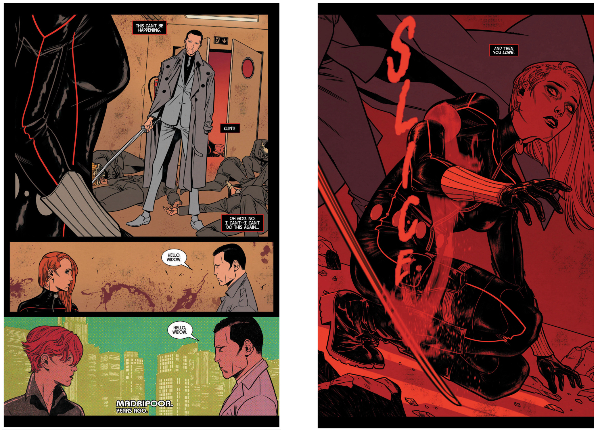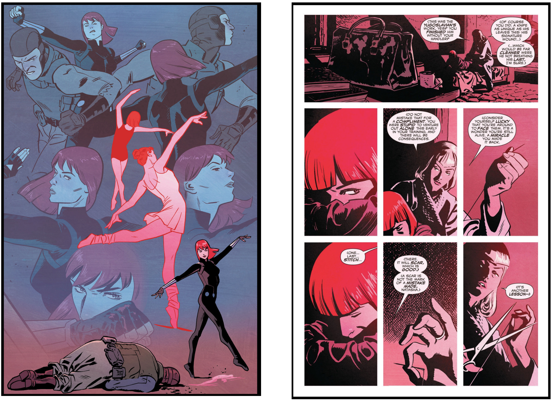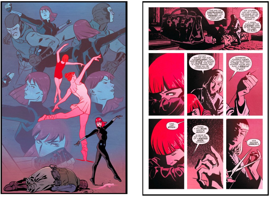 Instead of focusing on Natasha’s exposed body, Samnee depicts Black Widow in the context of images as a ballerina through the use of pastel colors and emphatic shading. As well, Natasha remains physically vulnerable, often battered, stabbed, and brought to exhaustion through a relentless parade of battles for her life.