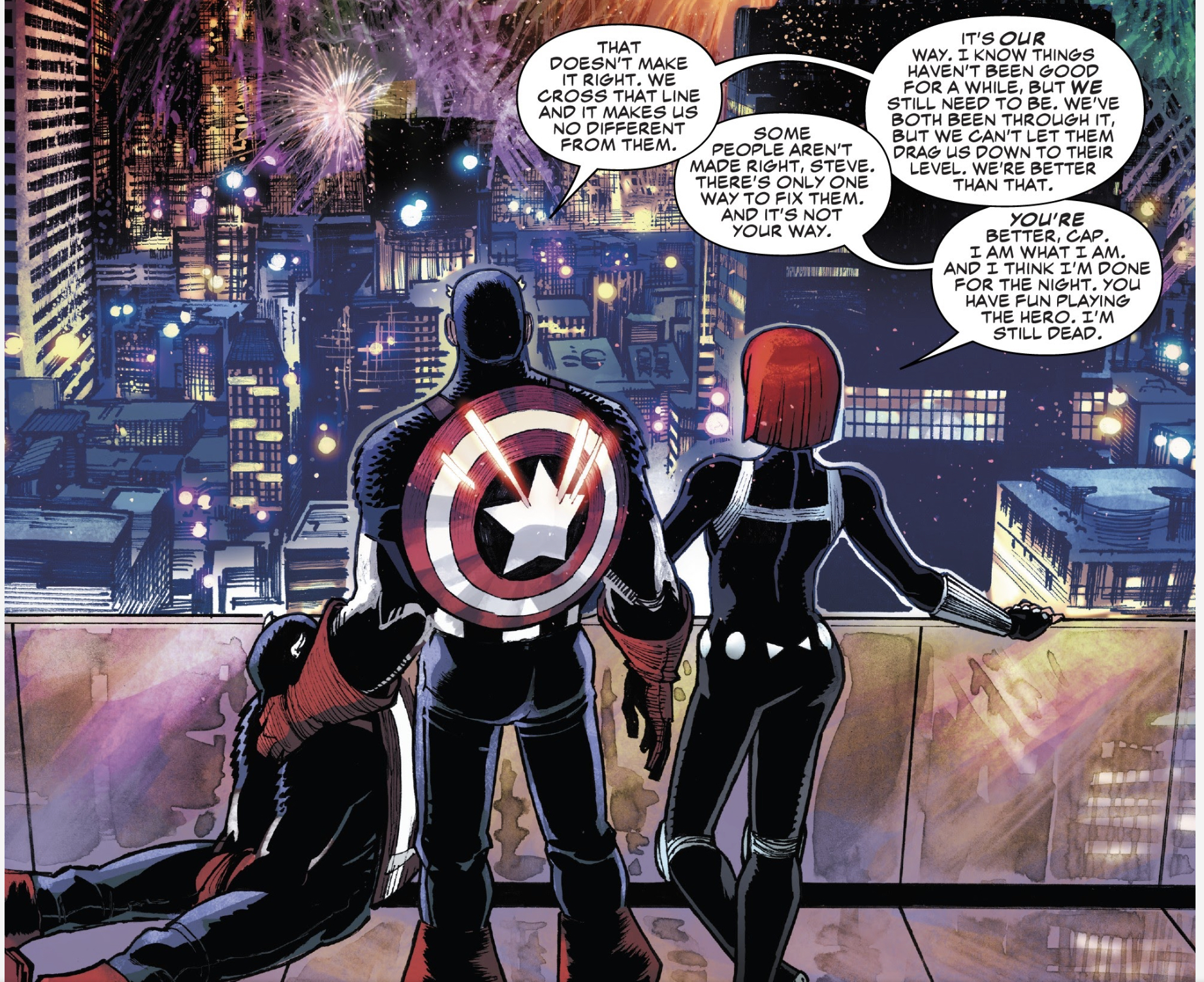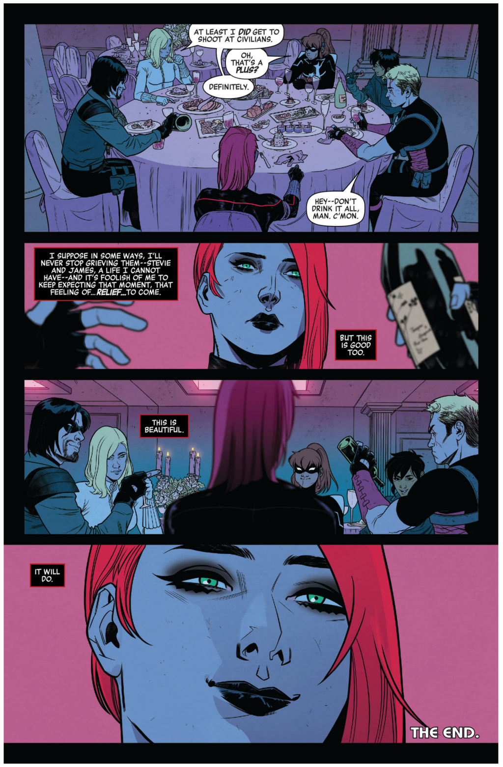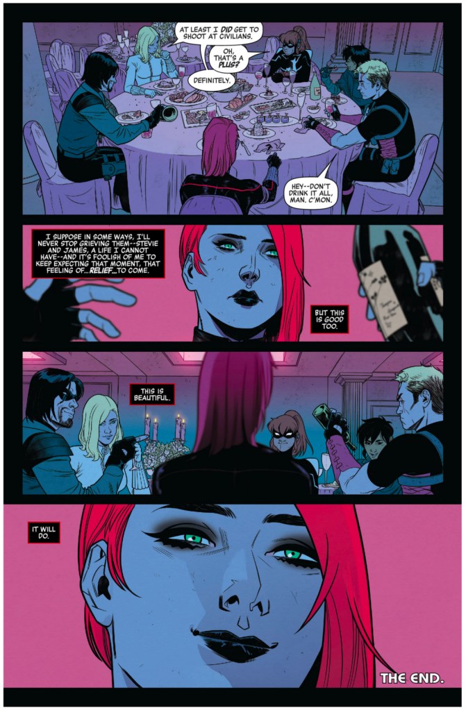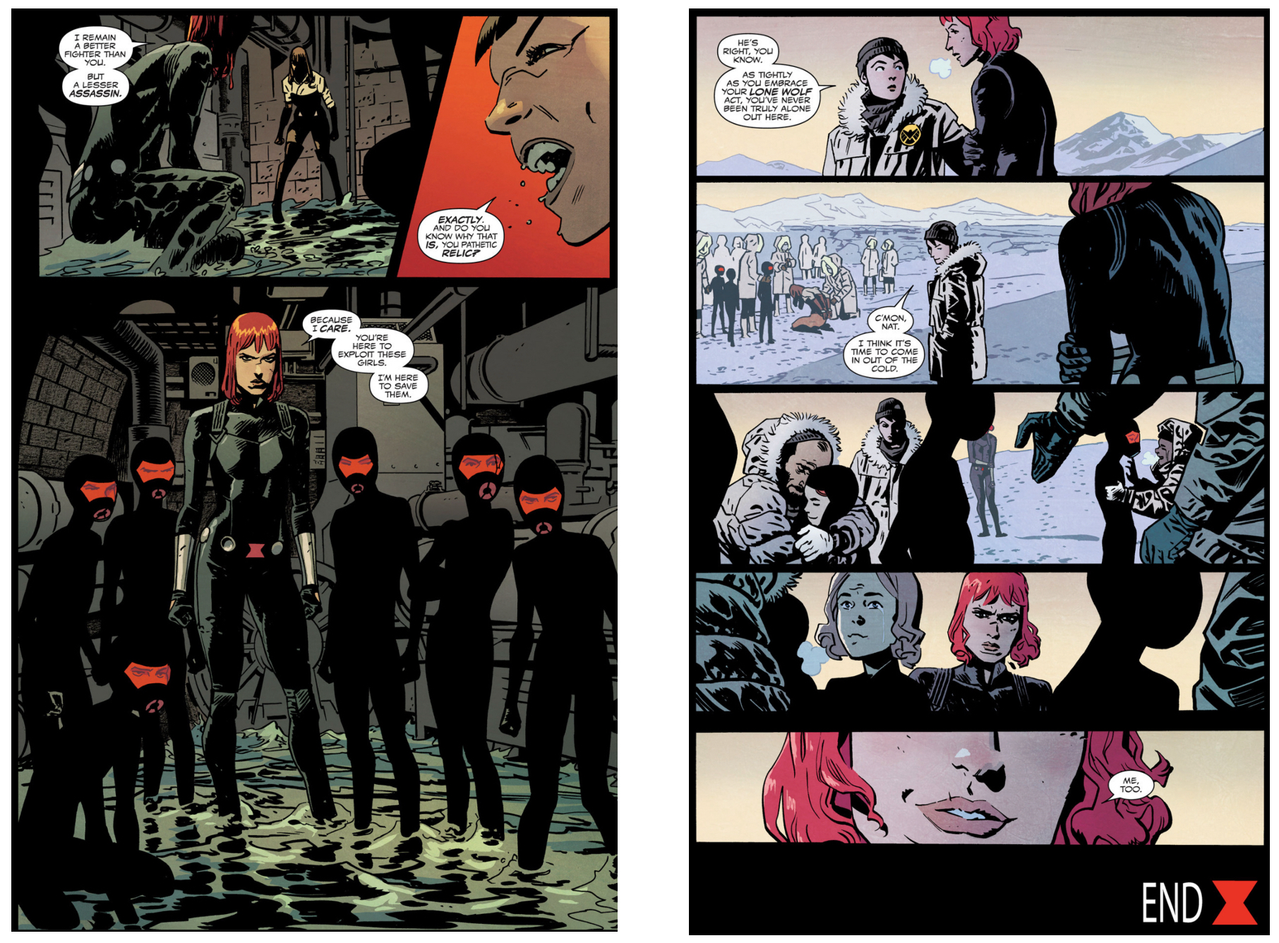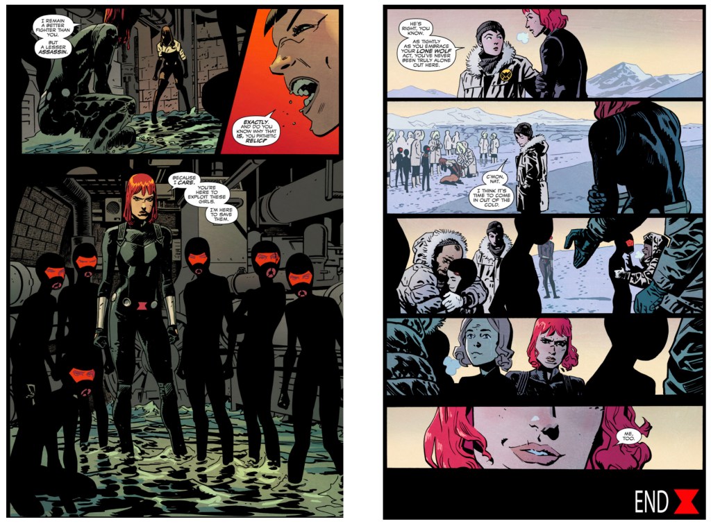 The final pages reveal Natasha providing Winter Soldier-like hands to the mutilated girl and reuniting with Steve Rogers: “It doesn’t matter how our story started. It’s up to us how it’s going to end.”