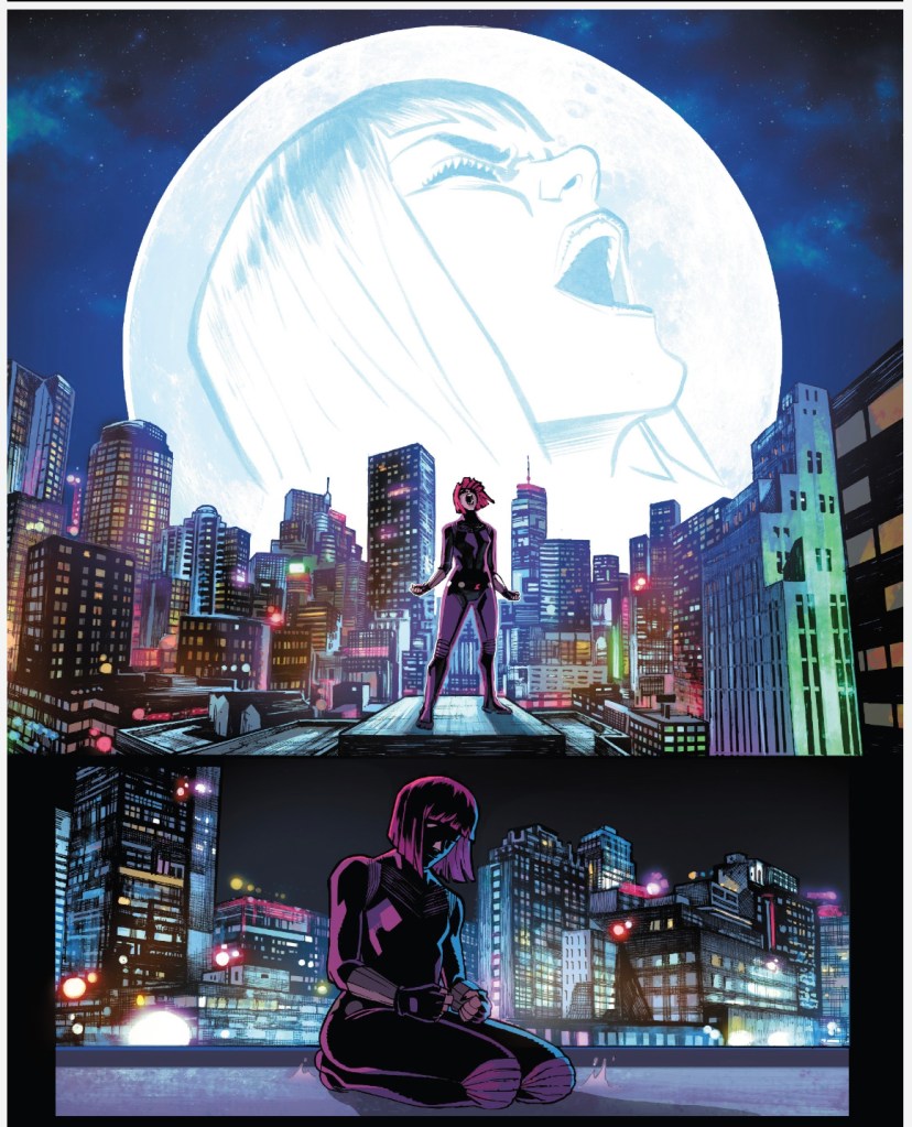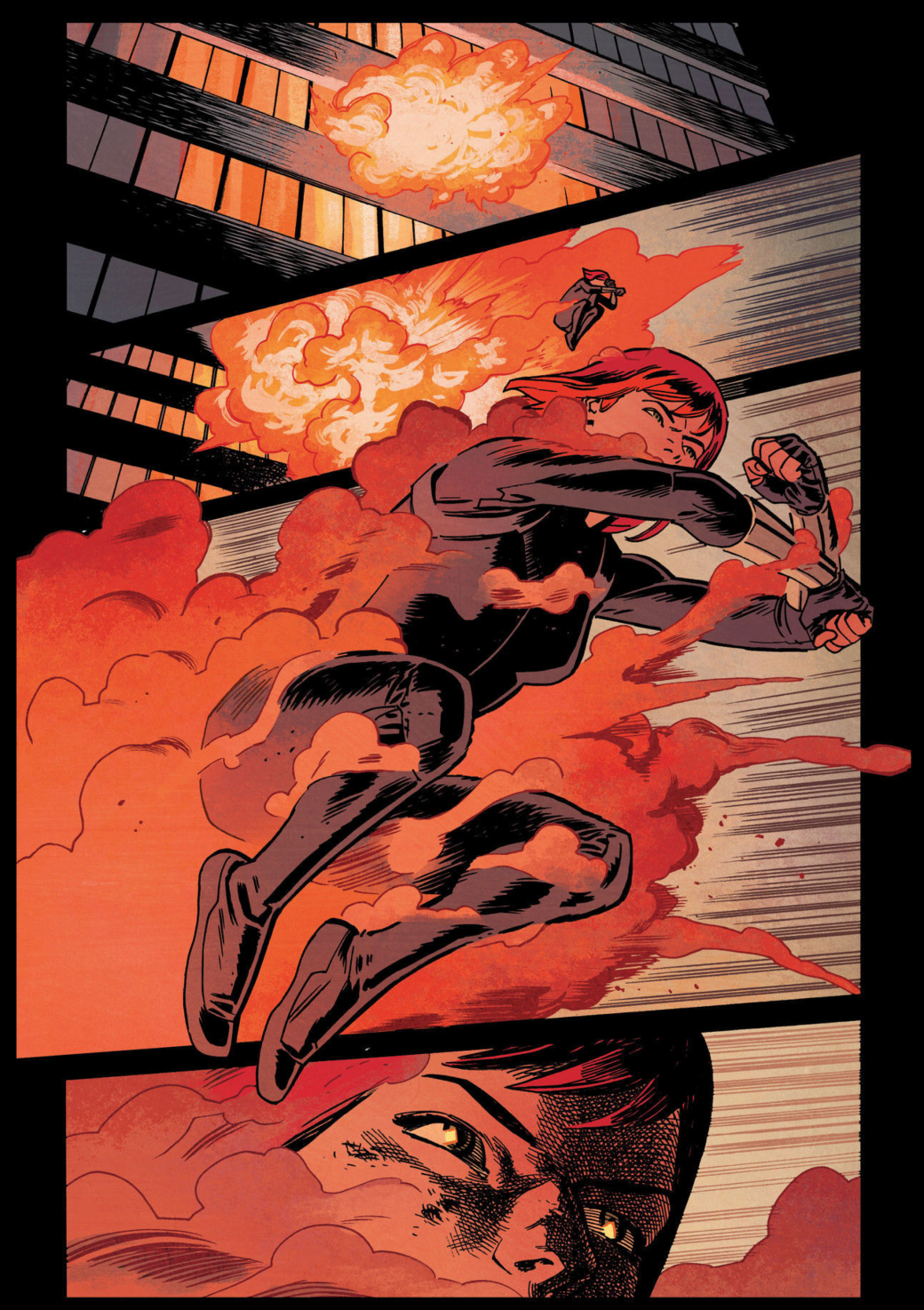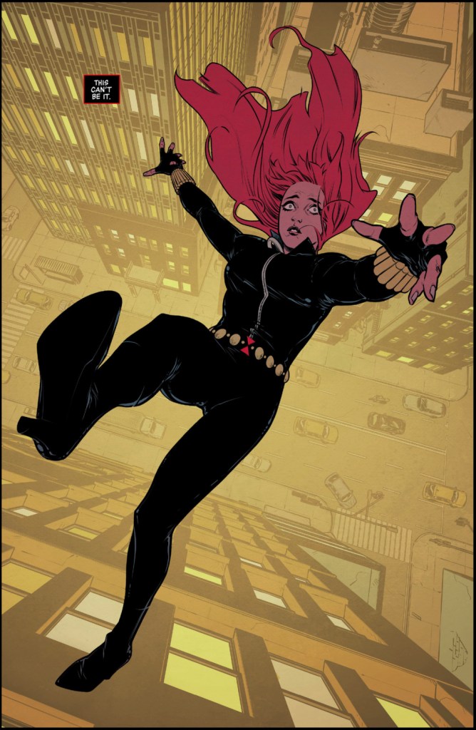 Just a few beautiful pages into issue 1—immediately situating Black Widow with Hawkeye and Captain America—Natasha thinks in dramatic fashion, “This can’t be it,” as she falls, drugged, from her apartment window.