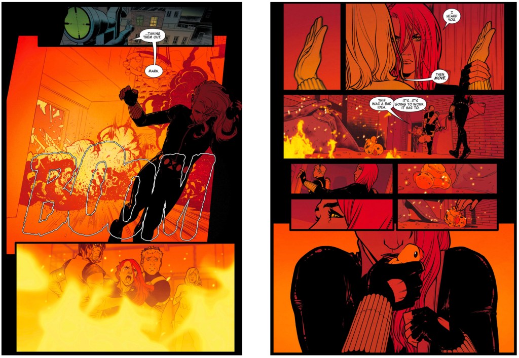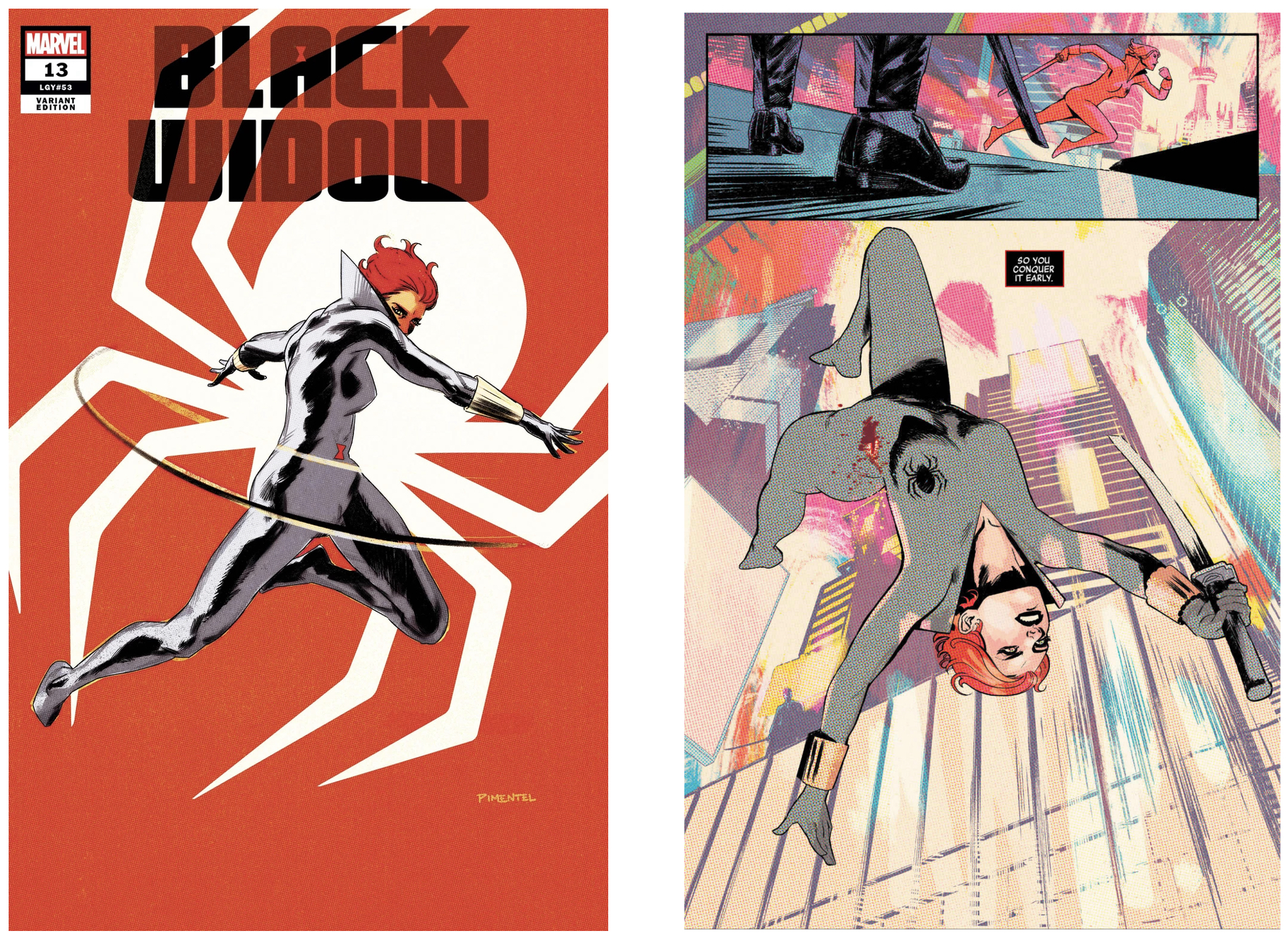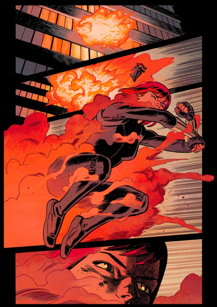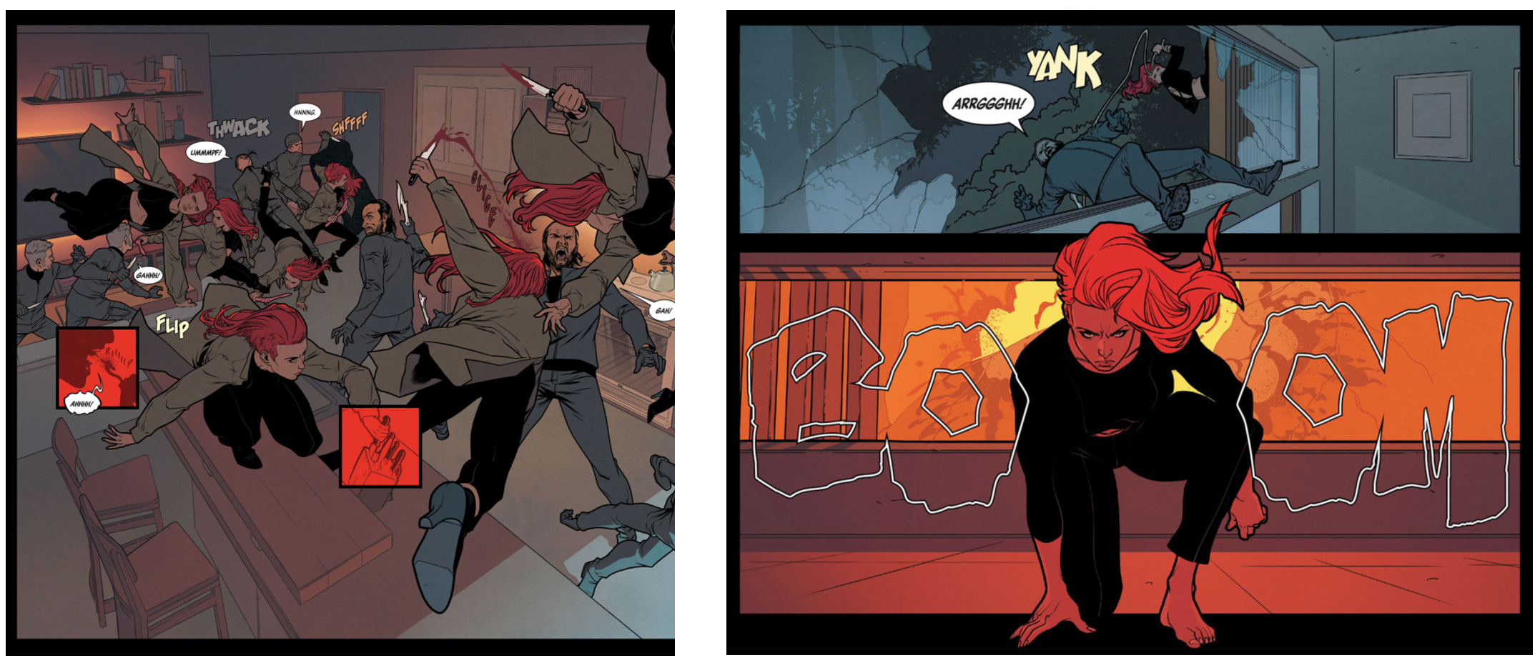 Issue 3 also portrays fresh and dynamic takes on iconic depictions of Black Widow—the acrobatic fight scene and the superhero landing pose: