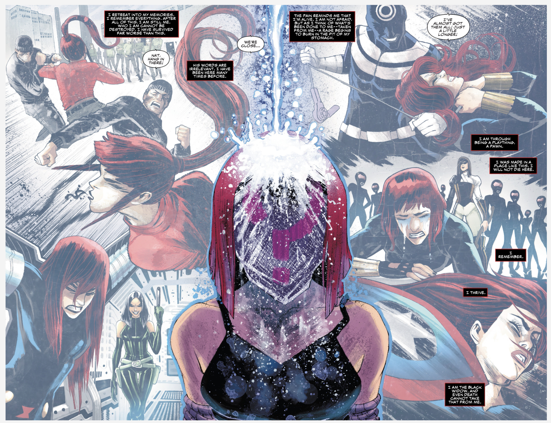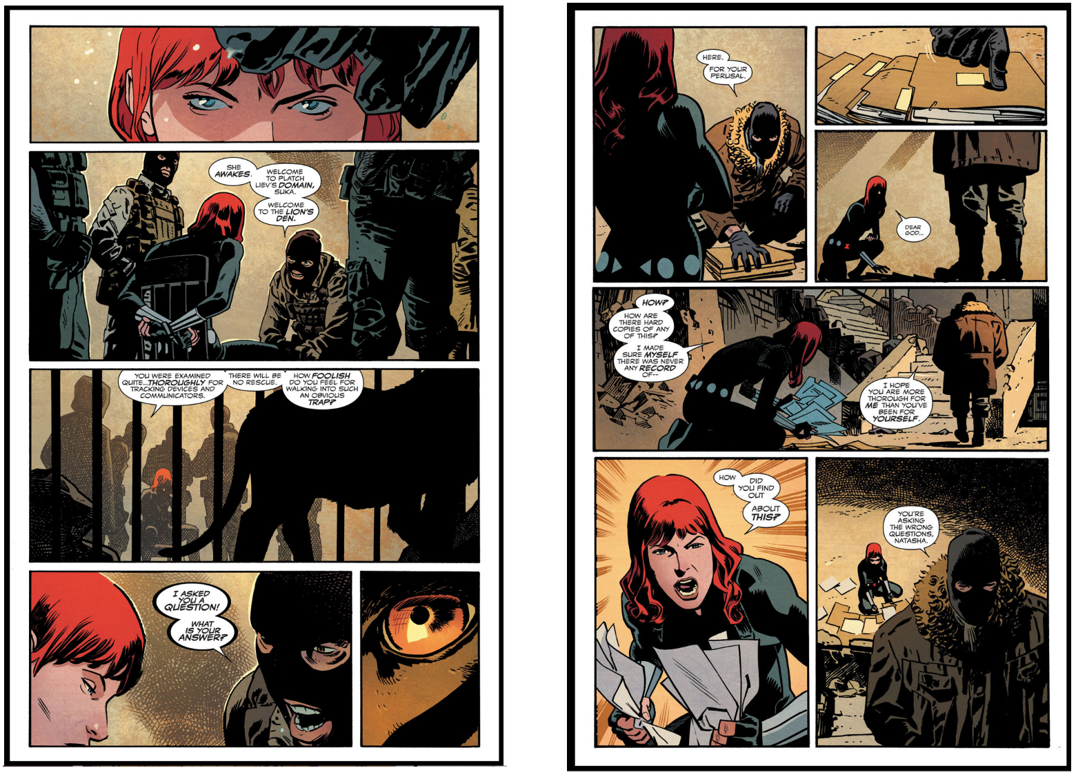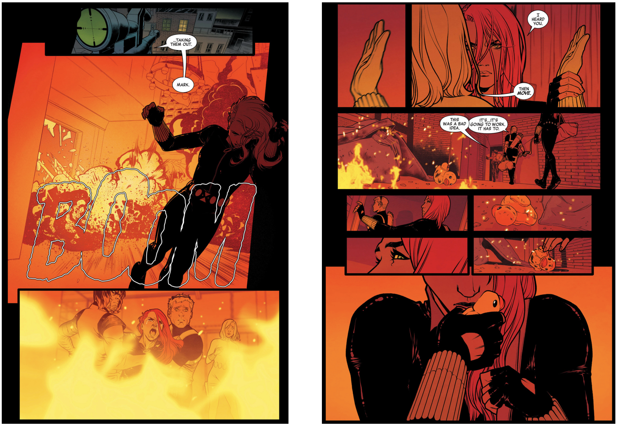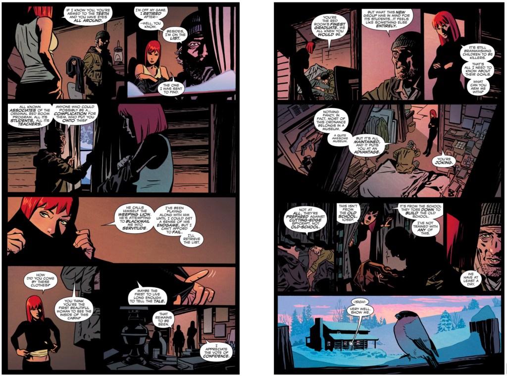 After parallel stabbings—from her past and in the present, returning to the Catacombs—Natasha confronts the Red Room Headmistress and Recluse, complicating the main narrative involving S.H.I.E.L.D. and Weeping Lion. After recovering with Iosef’s help, Natasha moves to her mission to recover intel for Weeping Lion, which goes wrong, dramatically and violently with S.H.I.E.L.D. involved. The lingering question of Natasha’s loyalty is left in the balance.