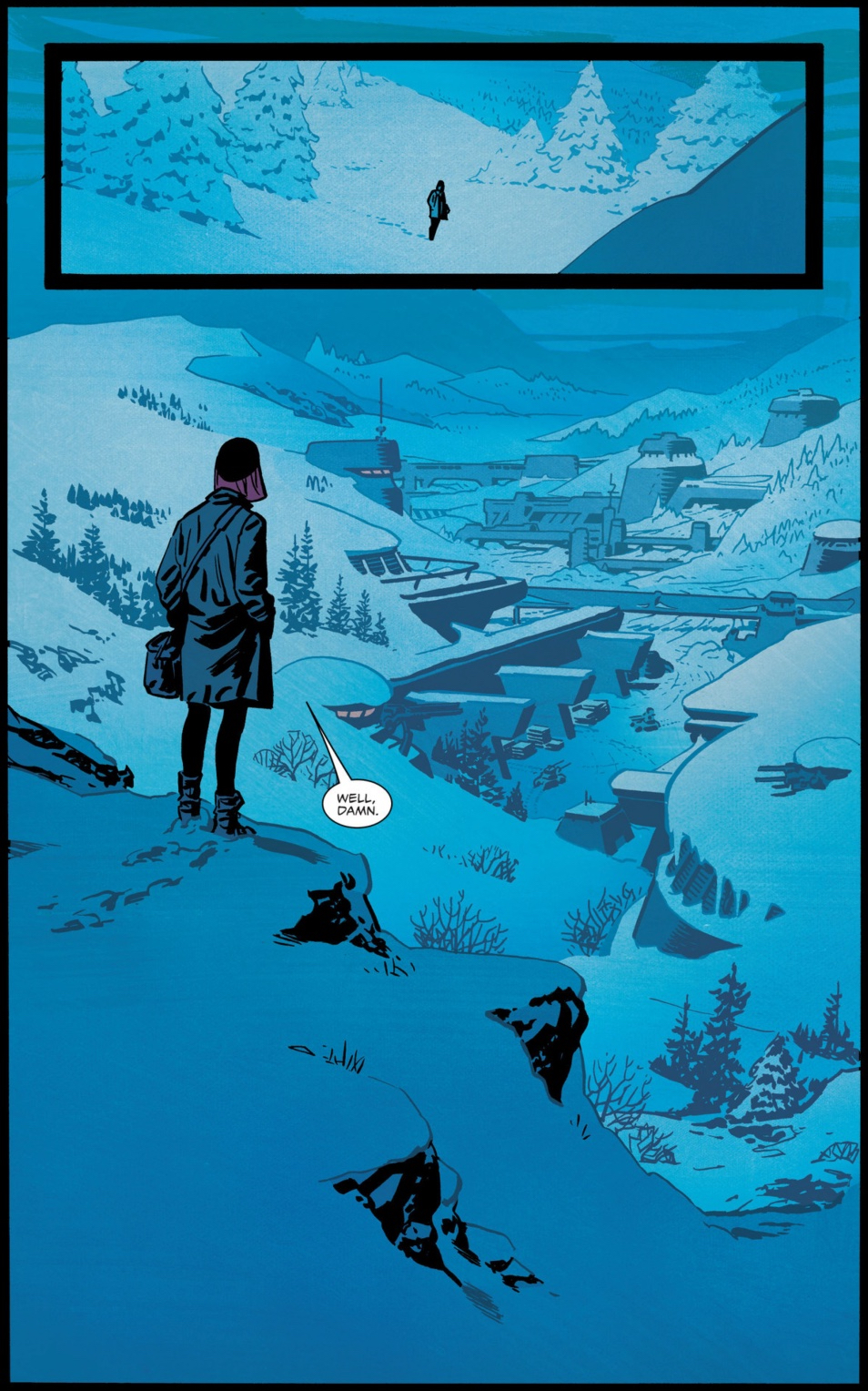 Samnee and Wilson build to Black Widow’s dramatic escape in the opening pages of issue 001 in v.6, highlighting Samnee’s panel designs and Wilson’s brilliant coloring.