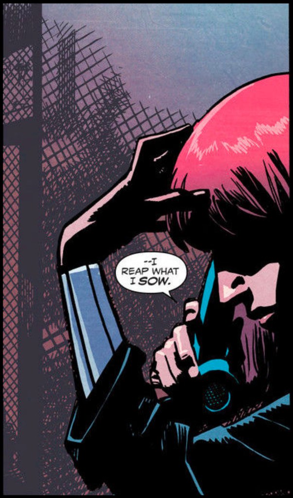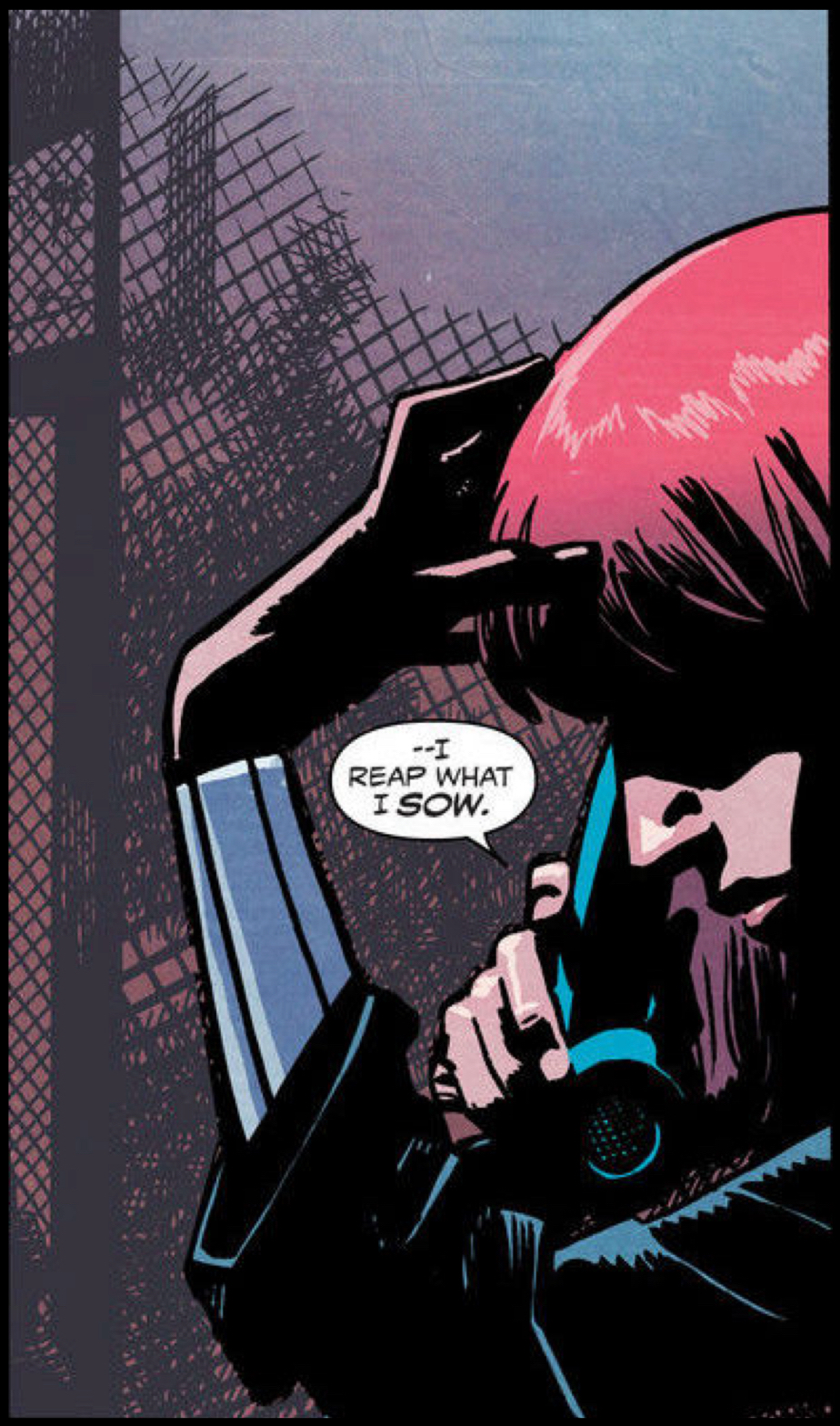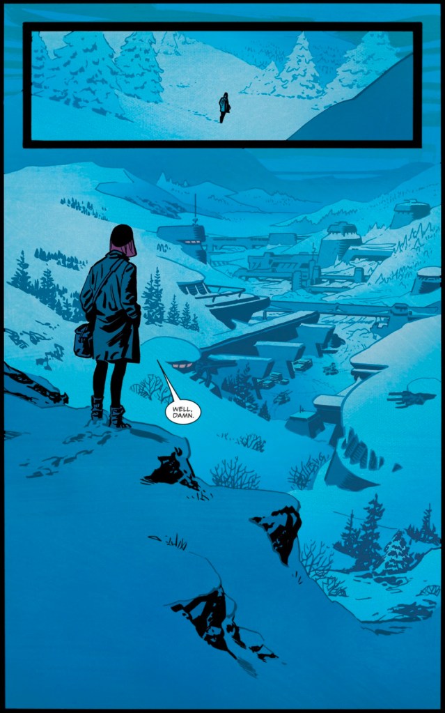 The use of blue on this full-page panel and the simple “Well, damn” captures the vastness of Nastasha living in the present while continuing to fight the past.
