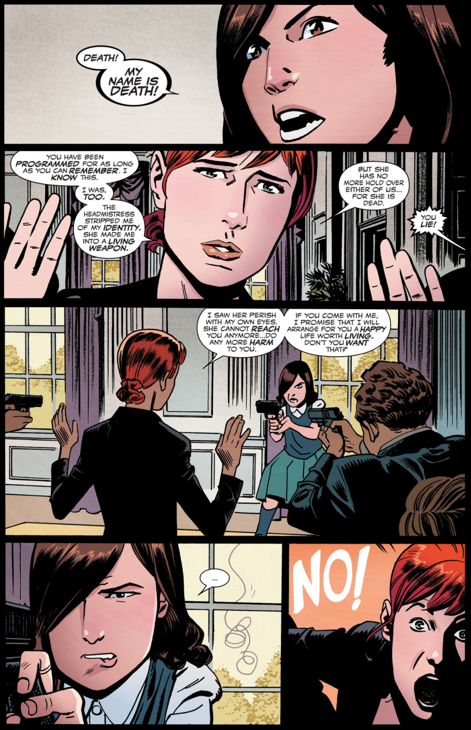 Issue 008 involves current-day child assassins in the White House with Natasha undercover. When the child assassins are exposed, Natasha confronts the girl calling herself “Death” with “You have been programmed for as long as you can remember. I know this. I was too.” Natasha adds that the Headmistress made her a “living weapon.”