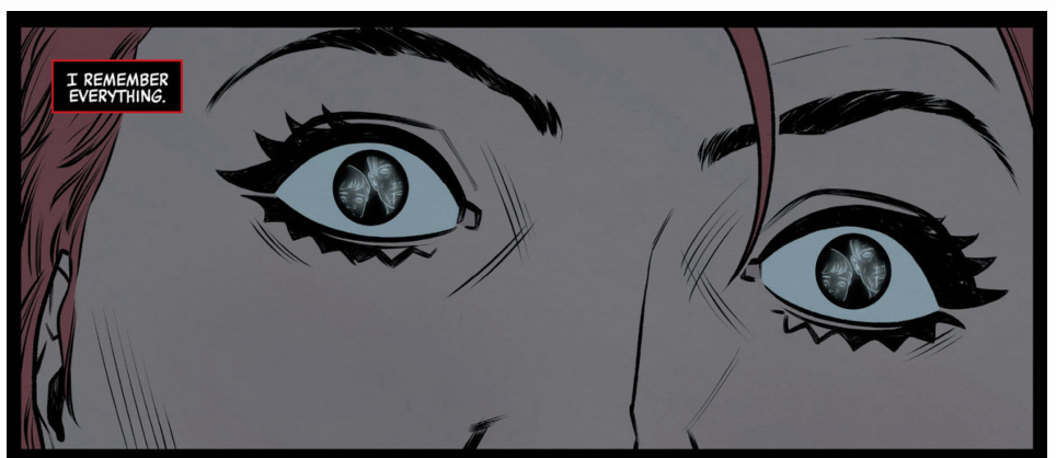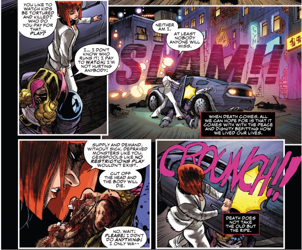 Natasha, the duo that is Weeping Lion, the Headmistress, and Recluse are all entangled by the end of issue 007 in a web of violence and an urge to seek justice warped by revenge and under the dark cloud of their pasts because Natasha failed to follow the full mandate of her assassin’s creed. After Headmistress’s death, Natasha claims, “…her mother did just die. I am not a monster.” The issue ends with Knezevic’s ominous, “Right.”