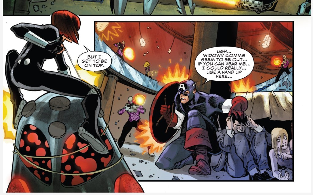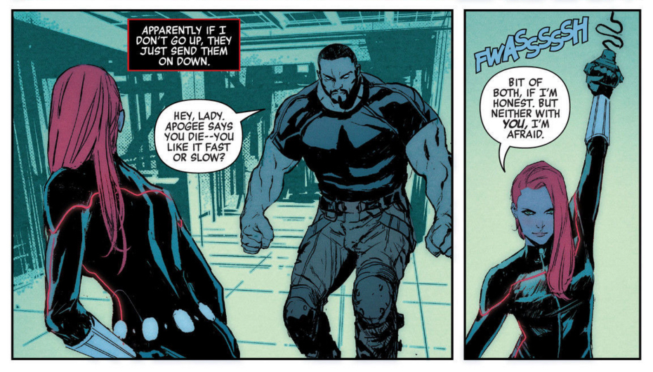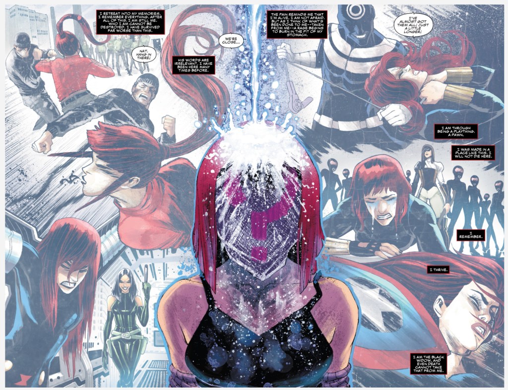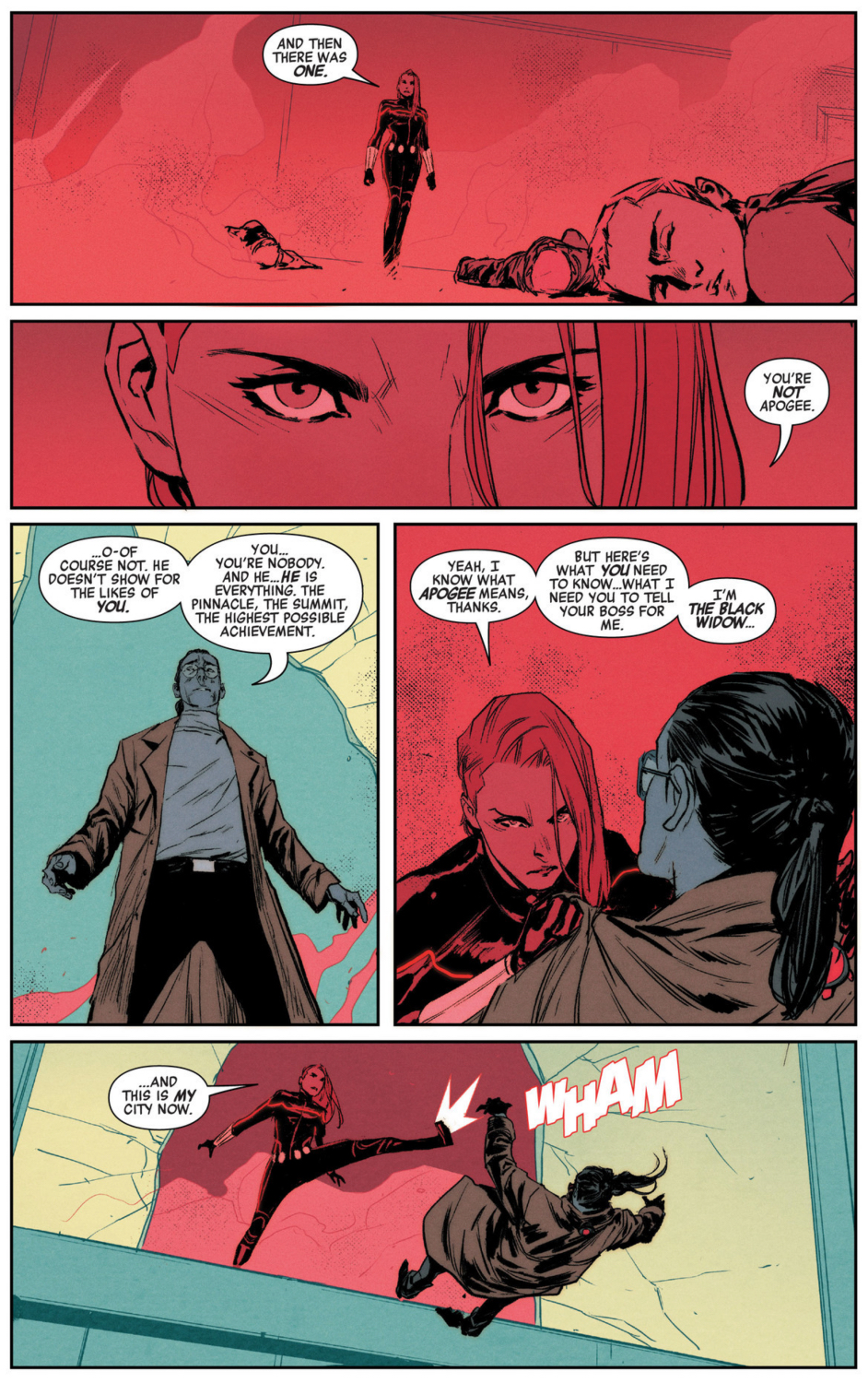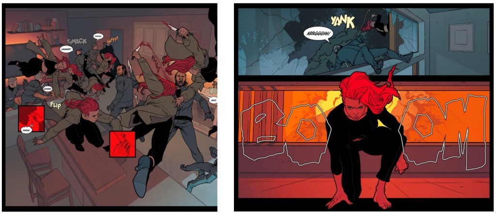 As Black Widow asserts control, the falling imagery in issue 6 parallels the first issue fall that is the initial transition of this volume.
