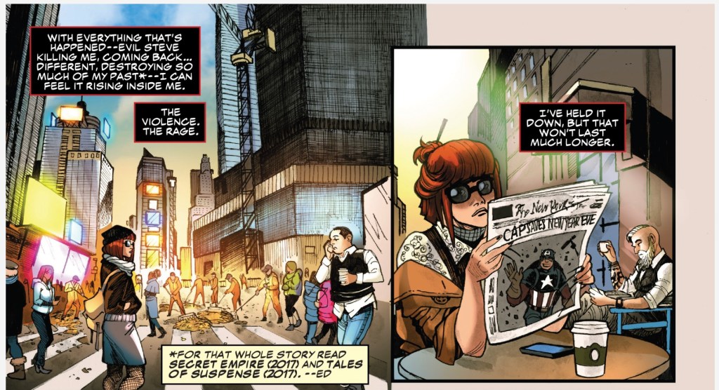 In hindsight, with Black Widow’s current limbo in mind, this seems like a signal larger than the narrative tension of yet another death of Natasha Romanoff. However, Natasha is not dead, but is discovered by Clint and Bucky to be living months later in San Francisco (a nod to the Daredevil/Black Widow run from the early 1970s) as Natalie with a partner and a child—seemingly unaware that she is Black Widow.